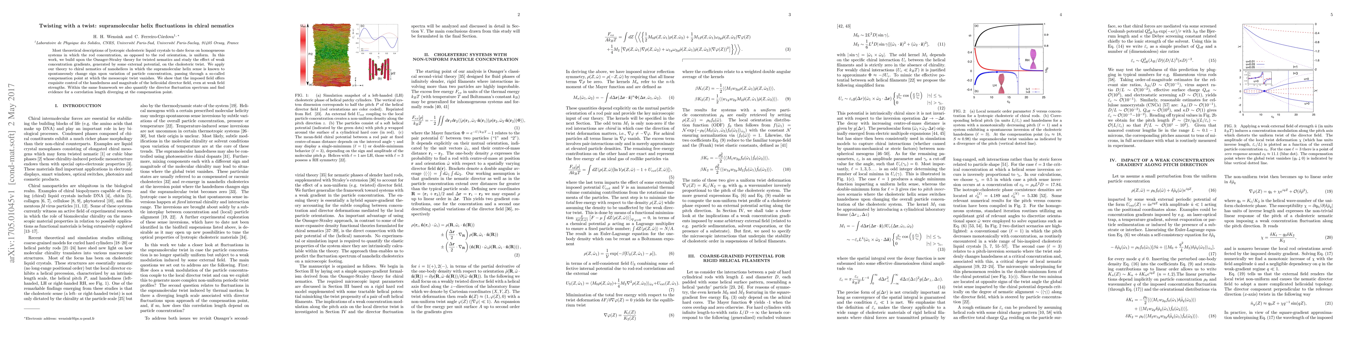 Most theoretical descriptions of lyotropic cholesteric liquid crystals to date focus on homogeneous systems in which the rod concentration, as opposed to the rod orientation, is uniform. In this work, we build upon the Onsager-Straley theory for twisted nematics and study the effect of weak concentration gradients, generated by some external potential, on the cholesteric twist. We apply our theory to chiral nematics of nanohelices in which the supramolecular helix sense is known to spontaneously change sign upon variation of particle concentration, passing through a so-called compensation point at which the mesoscopic twist vanishes. We show that the imposed field offers exquisite control of the handedness and magnitude of the helicoidal director field, even at weak field strengths. Within the same framework we also quantify the director fluctuation spectrum and find evidence for a correlation length diverging at the compensation point.