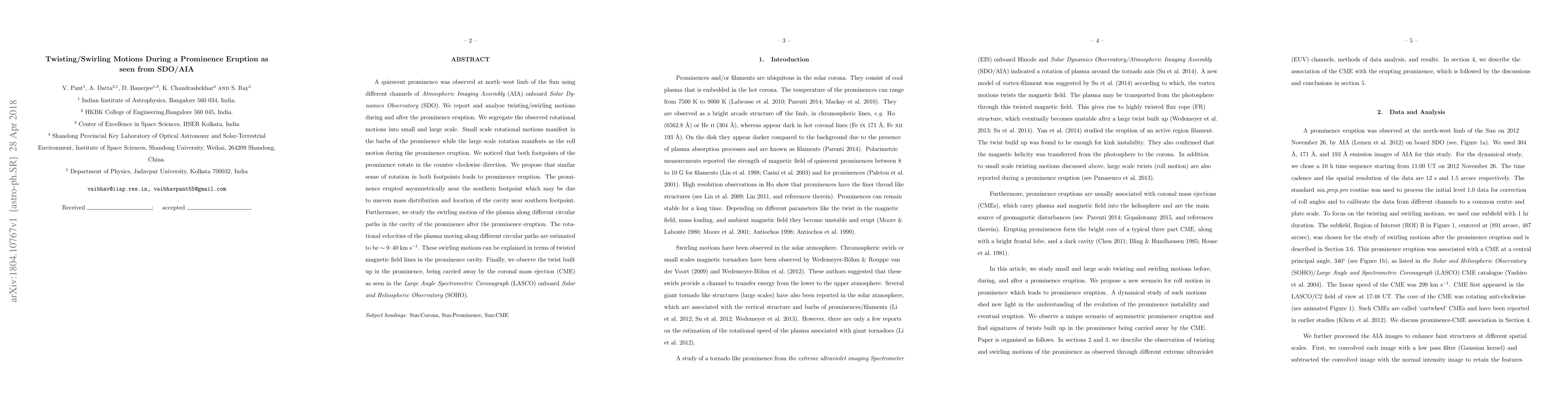This study observes a quiescent prominence eruption at the Sun's northwest limb using SDO/AIA, identifying twisting/swirling motions categorized into small and large scales. Both prominence footpoints rotate counter-clockwise, suggesting this rotation drives the eruption, which occurs asymmetrically due to uneven mass distribution. Post-eruption, plasma swirls in the prominence cavity at velocities of 9-40 km s$^{-1}$, indicative of twisted magnetic fields.