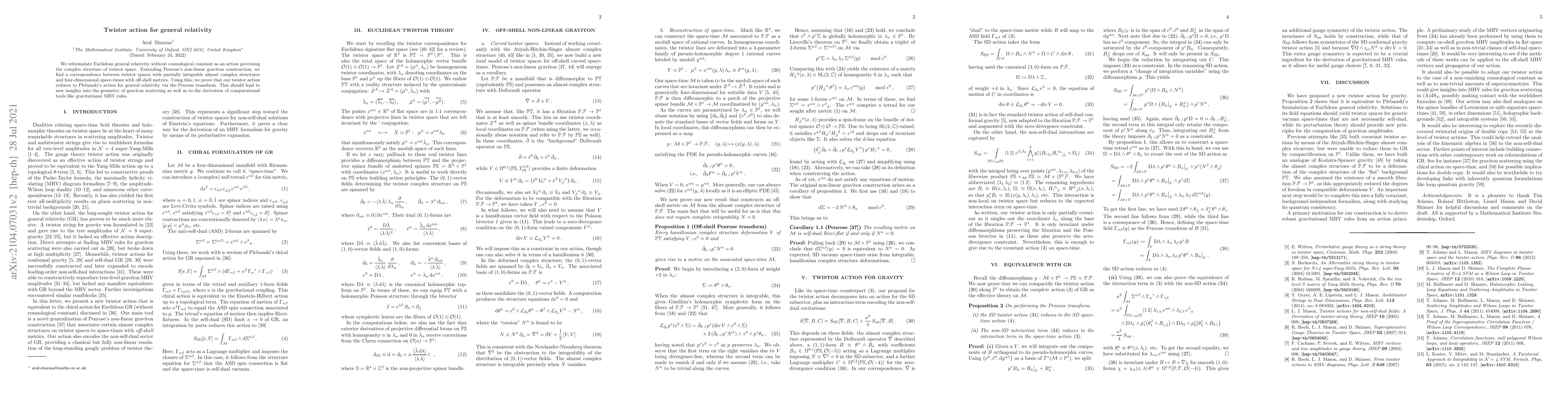 The paper reformulates Euclidean general relativity as an action in twistor space, establishing a correspondence between twistor structures and four-dimensional space-times, and demonstrating that this leads to Plebanski's action for general relativity through the Penrose transform. This approach is expected to yield new insights into graviton scattering and computational tools for gravitational MHV rules.