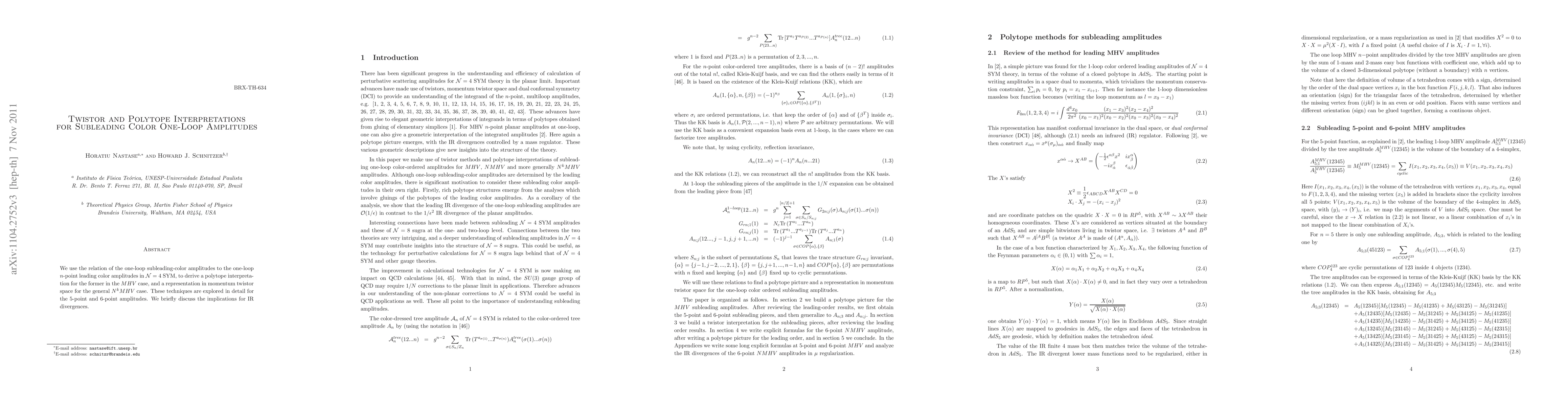 Researchers derived polytope interpretations for subleading-color one-loop amplitudes in 4D supersymmetric Yang-Mills theory, exploring their relation to leading color amplitudes and implications for infrared divergences.