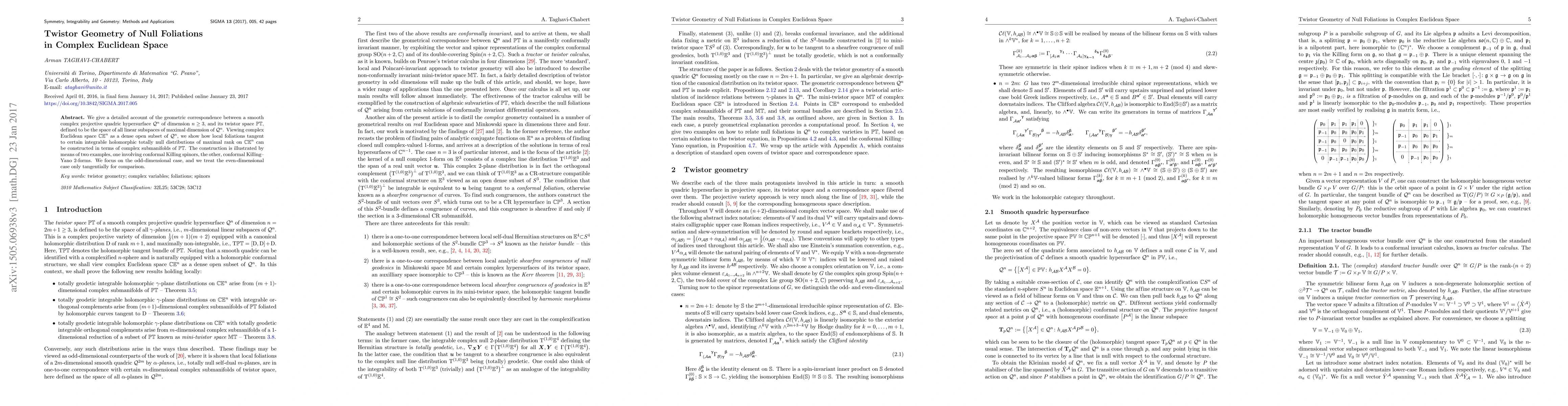 This paper explores the geometric correspondence between a complex projective quadric hypersurface and its twistor space, demonstrating how local foliations in complex Euclidean space can be constructed via complex submanifolds of the twistor space. It focuses on odd-dimensional cases, with a brief comparison to even-dimensional cases.
