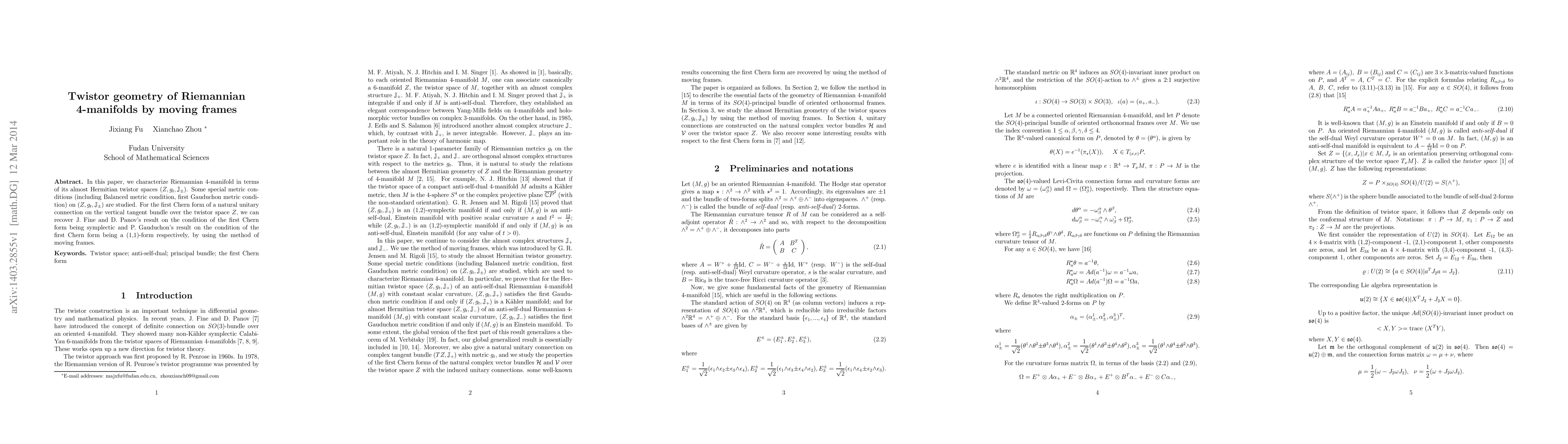 In this paper, we characterize Riemannian 4-manifold in terms of its almost Hermitian twistor spaces $(Z,g_t,\mathbb{J}_{\pm})$. Some special metric conditions (including Balanced metric condition, first Gauduchon metric condition) on $(Z,g_t,\mathbb{J}_{\pm})$ are studied. For the first Chern form of a natural unitary connection on the vertical tangent bundle over the twistor space $Z$, we can recover J. Fine and D. Panov's result on the condition of the first Chern form being symplectic and P. Gauduchon's result on the condition of the first Chern form being a (1,1)-form respectively, by using the method of moving frames.