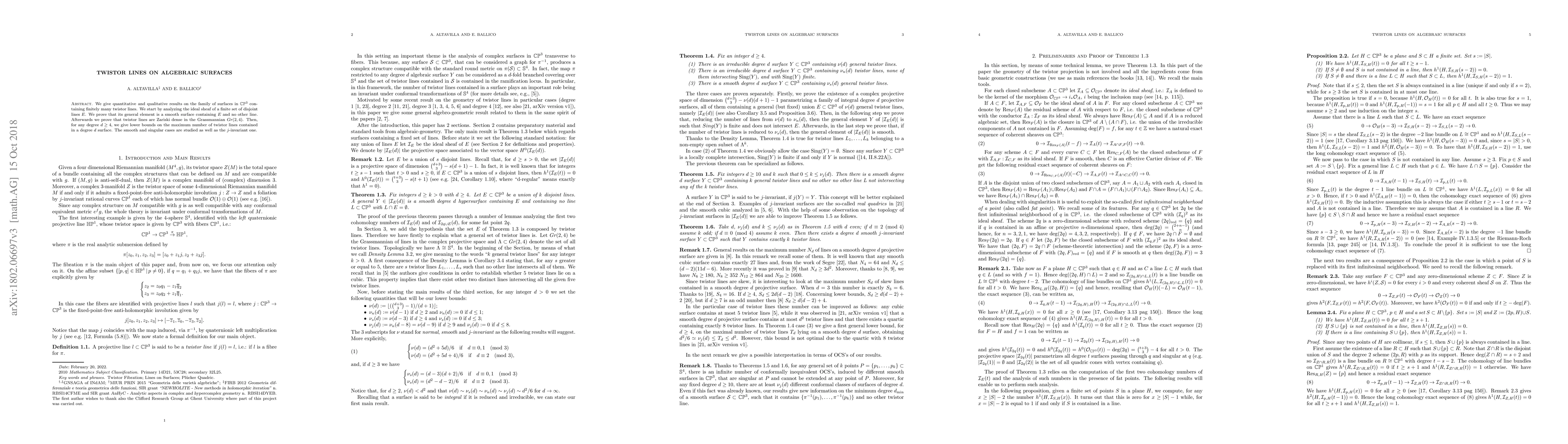 We give quantitative and qualitative results on the family of surfaces in $\mathbb{CP}^3$ containing finitely many twistor lines. We start by analyzing the ideal sheaf of a finite set of disjoint lines $E$. We prove that its general element is a smooth surface containing $E$ and no other line. Afterwards we prove that twistor lines are Zariski dense in the Grassmannian $Gr(2,4)$. Then, for any degree $d\ge 4$, we give lower bounds on the maximum number of twistor lines contained in a degree $d$ surface. The smooth and singular cases are studied as well as the $j$-invariant one.
