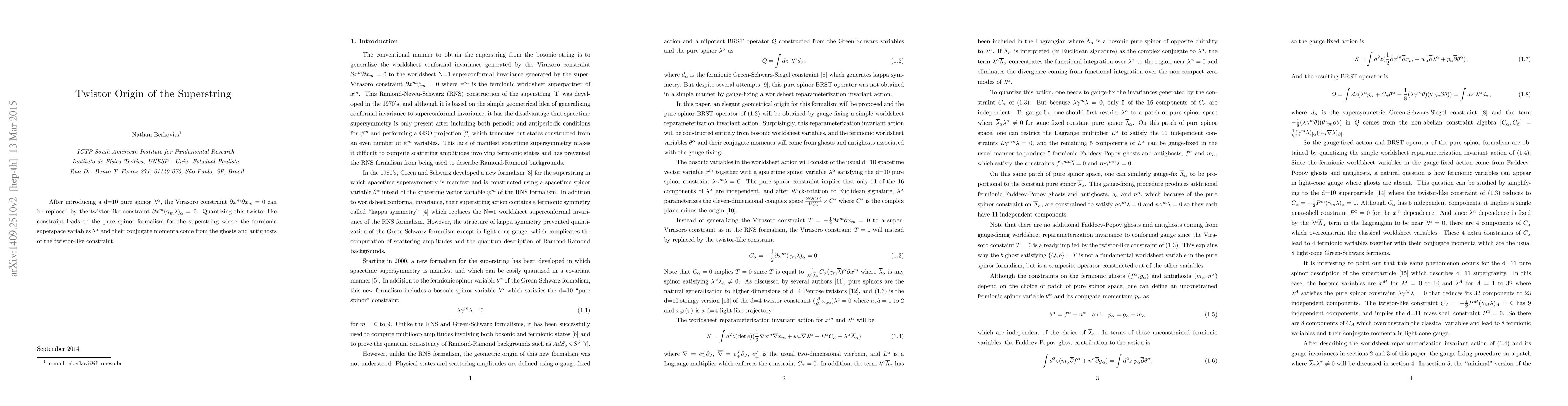 After introducing a d=10 pure spinor $\lambda^\alpha$, the Virasoro constraint $\partial x^m \partial x_m =0$ can be replaced by the twistor-like constraint $\partial x^m (\gamma_m \lambda)_\alpha=0$. Quantizing this twistor-like constraint leads to the pure spinor formalism for the superstring where the fermionic superspace variables $\theta^\alpha$ and their conjugate momenta come from the ghosts and antighosts of the twistor-like constraint.