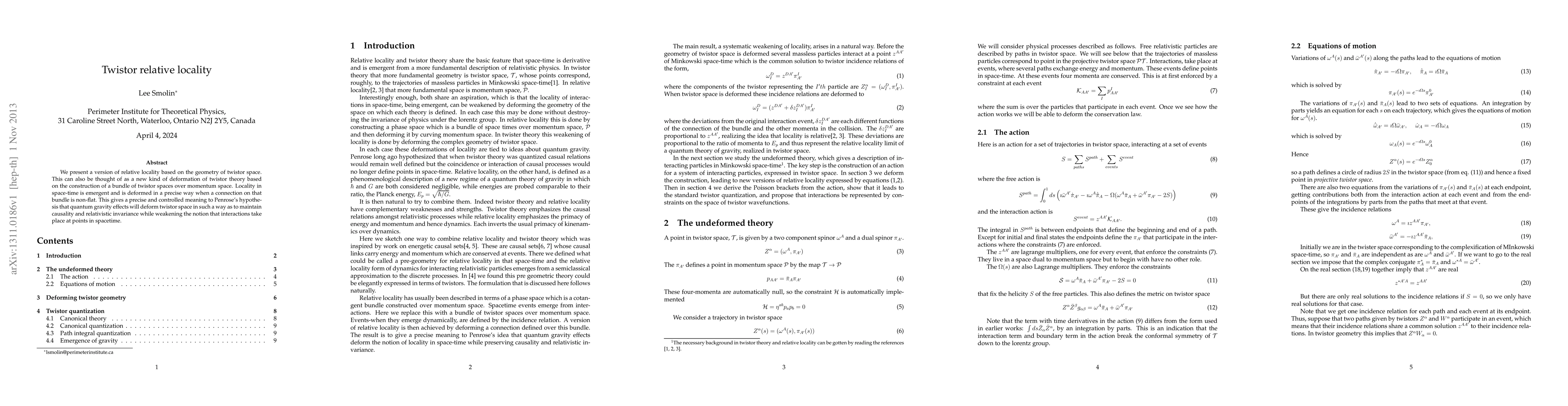 We present a version of relative locality based on the geometry of twistor space. This can also be thought of as a new kind of deformation of twistor theory based on the construction of a bundle of twistor spaces over momentum space. Locality in space-time is emergent and is deformed in a precise way when a connection on that bundle is non-flat. This gives a precise and controlled meaning to Penrose's hypothesis that quantum gravity effects will deform twistor space in such a way as to maintain causality and relativistic invariance while weakening the notion that interactions take place at points in spacetime.