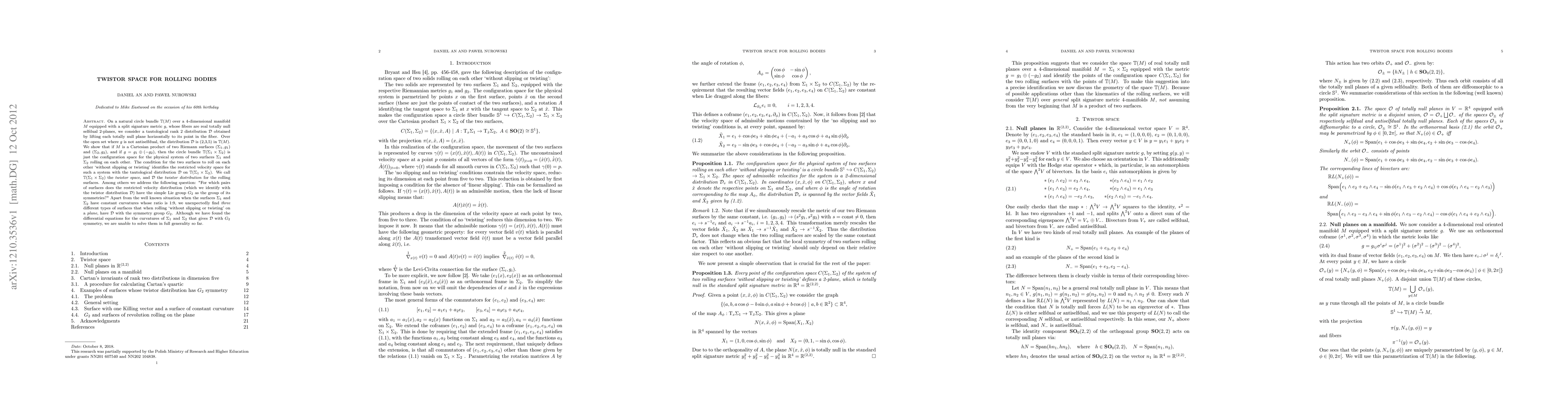 Researchers found a mathematical framework that describes the motion of two solid bodies rolling on each other without slipping or twisting, using a concept called twistor space. They discovered three types of surfaces with specific symmetries that enable this type of motion.