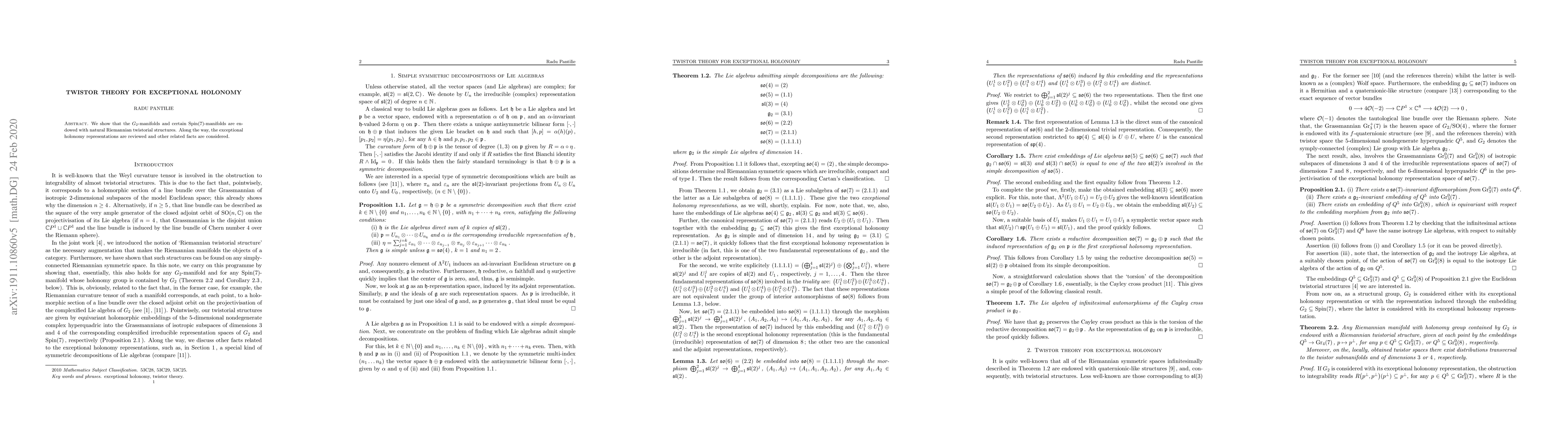 We show that the $G_2$-manifolds and certain ${\rm Spin}(7)$-manifolds are endowed with natural Riemannian twistorial structures. Along the way, the exceptional holonomy representations are reviewed and other related facts are considered.
