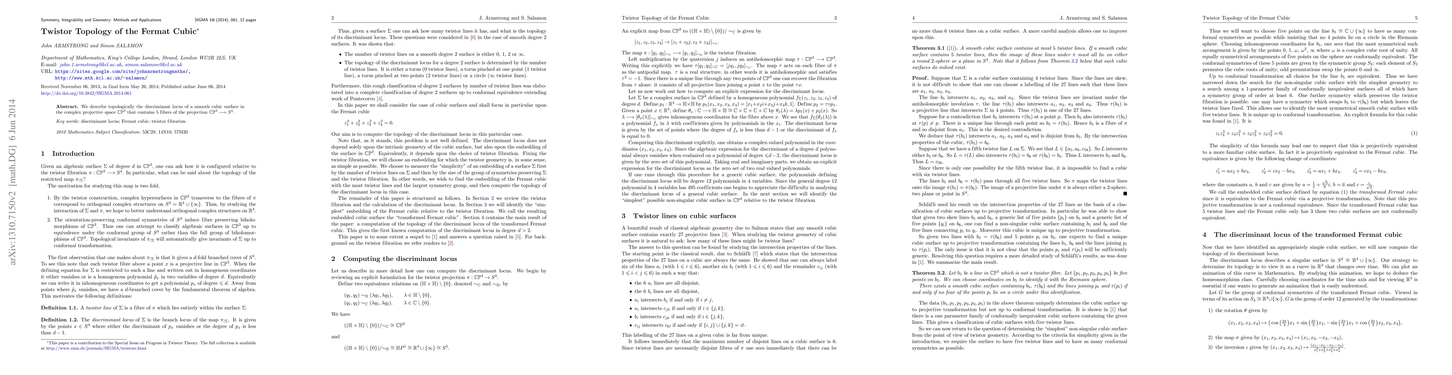 We describe topologically the discriminant locus of a smooth cubic surface in the complex projective space ${\mathbb{CP}}^3$ that contains 5 fibres of the projection ${\mathbb{CP}}^3 \longrightarrow S^4$.