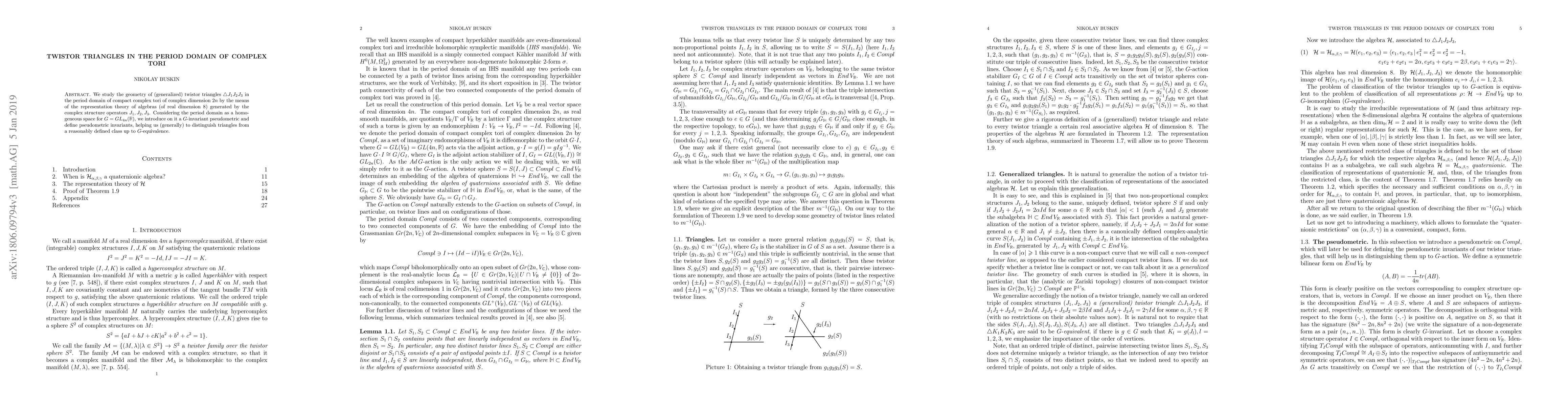 This paper investigates the geometry of generalized twistor triangles in the period domain of complex tori using representation theory of algebras generated by complex structures. It introduces a $G$-invariant pseudometric on the period domain to define invariants that distinguish triangles up to $G$-equivalence.