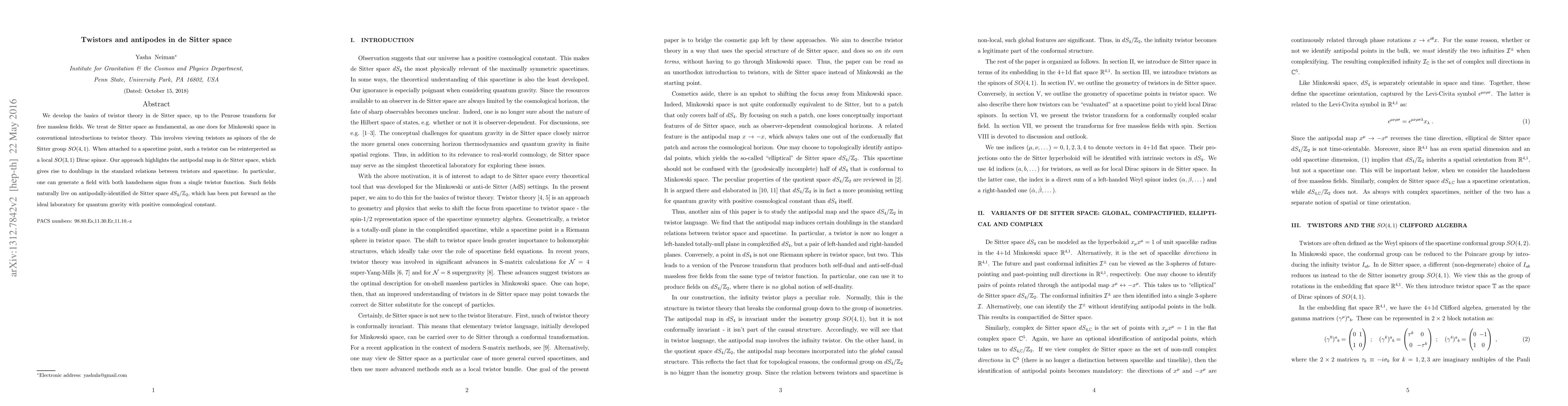 This paper develops twistor theory for de Sitter space, treating it as fundamental, and introduces the Penrose transform for free massless fields. It highlights the antipodal map, leading to doublings in twistor-spacetime relations and generating fields with both handedness signs from a single twistor function.