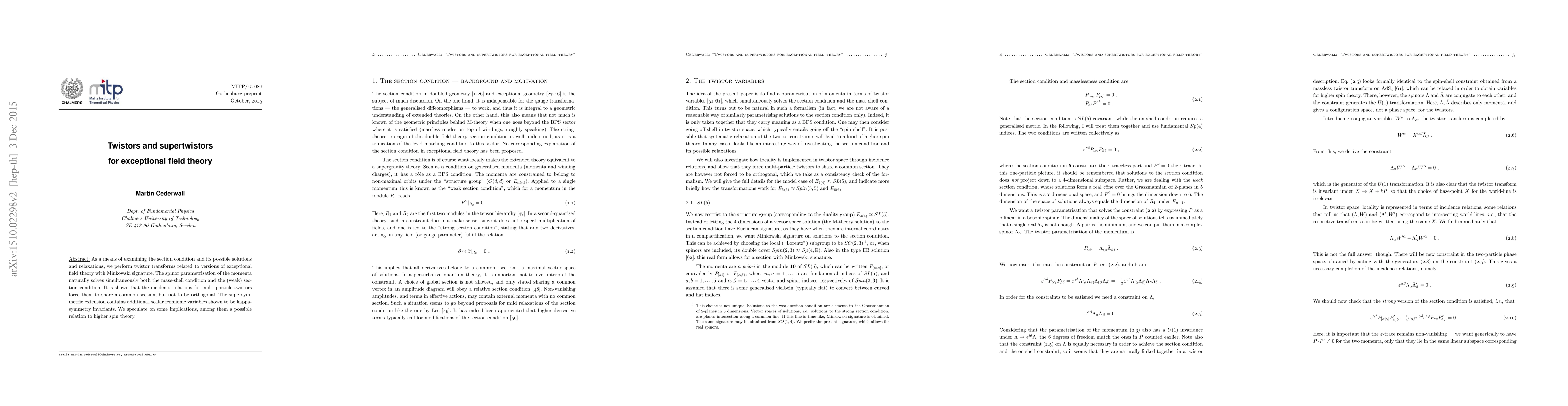 As a means of examining the section condition and its possible solutions and relaxations, we perform twistor transforms related to versions of exceptional field theory with Minkowski signature. The spinor parametrisation of the momenta naturally solves simultaneously both the mass-shell condition and the (weak) section condition. It is shown that the incidence relations for multi-particle twistors force them to share a common section, but not to be orthogonal. The supersymmetric extension contains additional scalar fermionic variables shown to be kappa-symmetry invariants. We speculate on some implications, among them a possible relation to higher spin theory.