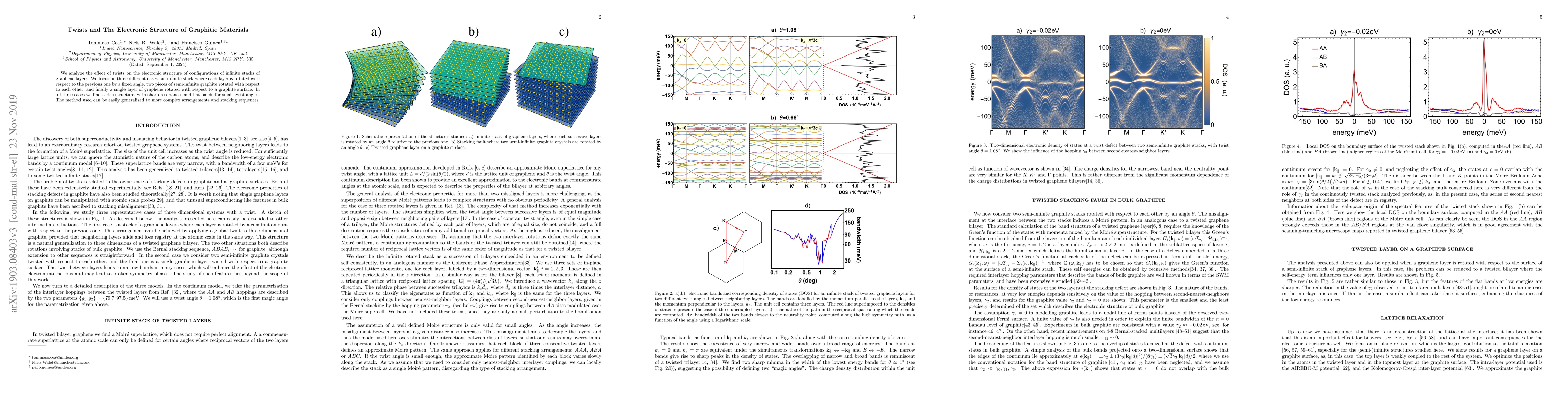 We analyze the effect of twists on the electronic structure of configurations of infinite stacks of graphene layers. We focus on three different cases: an infinite stack where each layer is rotated with respect to the previous one by a fixed angle, two pieces of semi-infinite graphite rotated with respect to each other, and finally a single layer of graphene rotated with respect to a graphite surface. In all three cases we find a rich structure, with sharp resonances and flat bands for small twist angles. The method used can be easily generalized to more complex arrangements and stacking sequences.