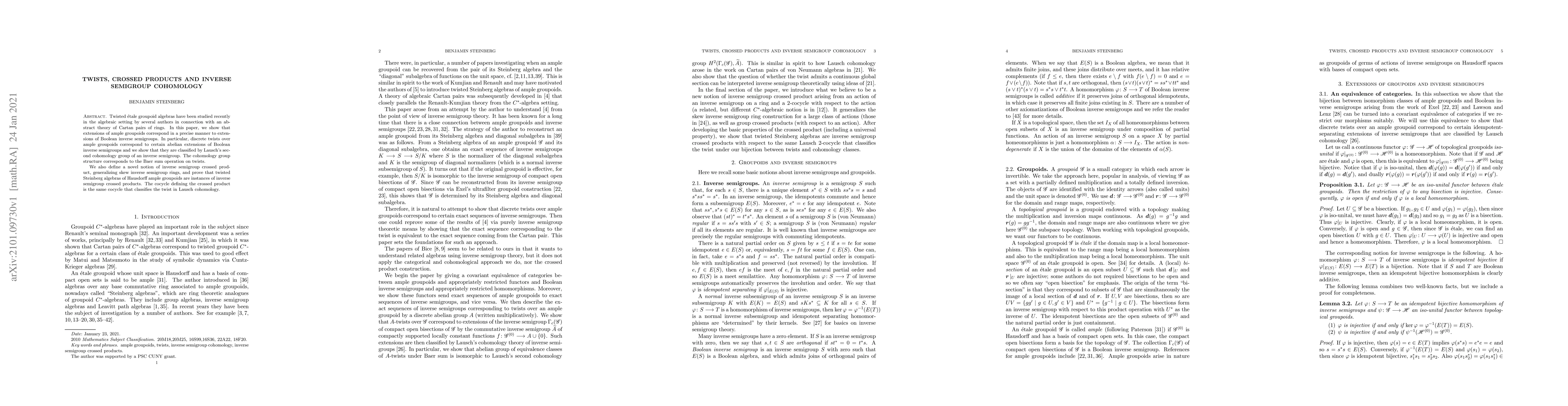 Twisted \'etale groupoid algebras have been studied recently in the algebraic setting by several authors in connection with an abstract theory of Cartan pairs of rings. In this paper, we show that extensions of ample groupoids correspond in a precise manner to extensions of Boolean inverse semigroups. In particular, discrete twists over ample groupoids correspond to certain abelian extensions of Boolean inverse semigroups and we show that they are classified by Lausch's second cohomology group of an inverse semigroup. The cohomology group structure corresponds to the Baer sum operation on twists. We also define a novel notion of inverse semigroup crossed product, generalizing skew inverse semigroup rings, and prove that twisted Steinberg algebras of Hausdorff ample groupoids are instances of inverse semigroup crossed products. The cocycle defining the crossed product is the same cocycle that classifies the twist in Lausch cohomology.