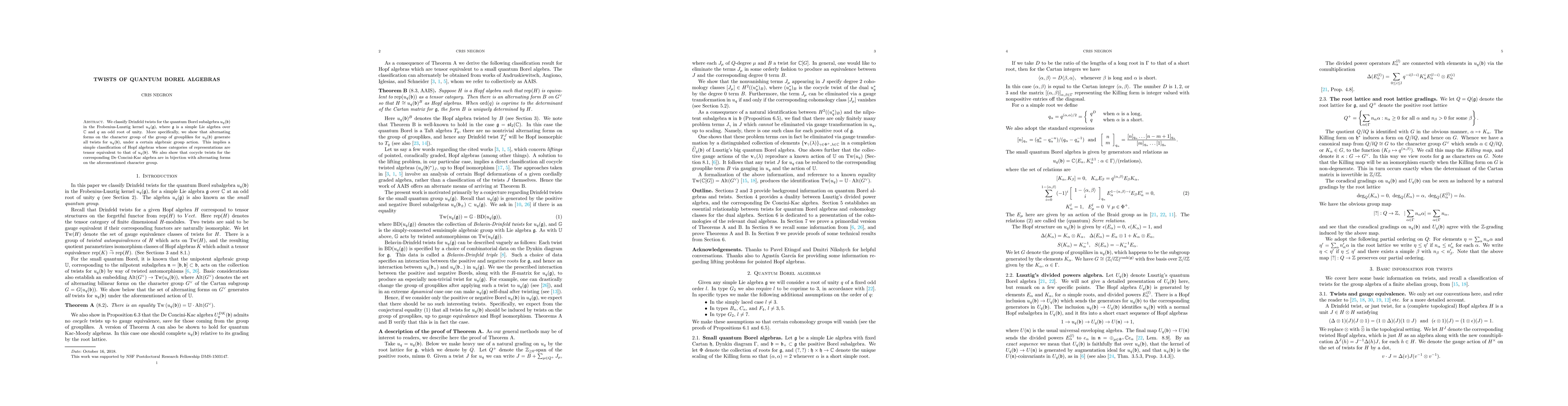 This paper classifies Drinfeld twists for the quantum Borel subalgebra u_q(b) within the Frobenius-Lusztig kernel u_q(g), demonstrating that alternating forms on the character group of the grouplikes for u_q(b) generate all twists. It also establishes a bijection between cocycle twists of the De Concini-Kac algebra and these alternating forms.