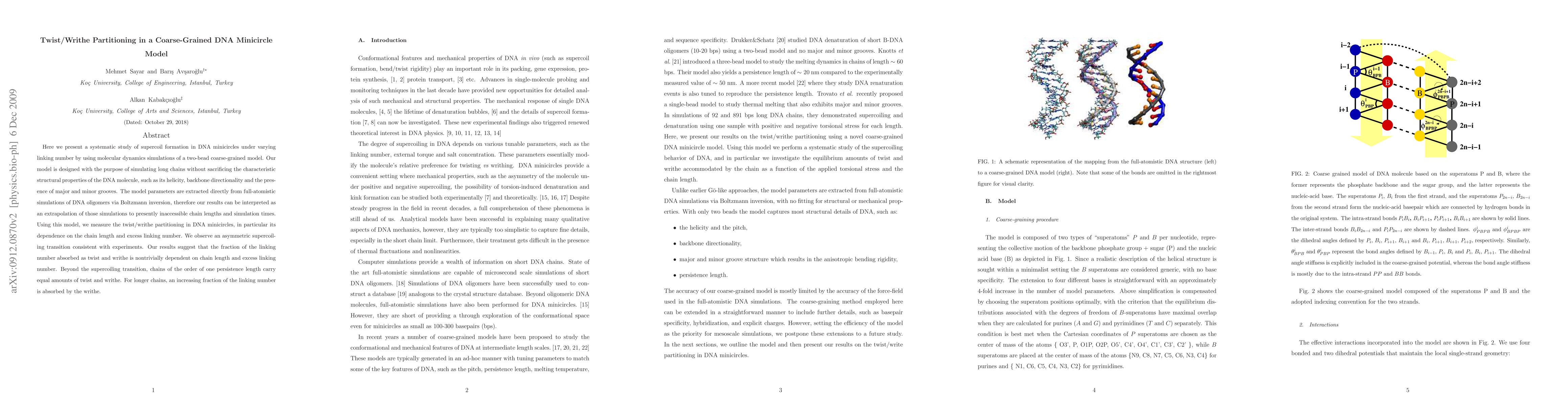 This paper investigates supercoil formation in DNA minicircles using a coarse-grained model and molecular dynamics simulations, finding that twist/writhe partitioning depends on chain length and excess linking number, with longer chains absorbing more linking number as writhe beyond a certain transition.