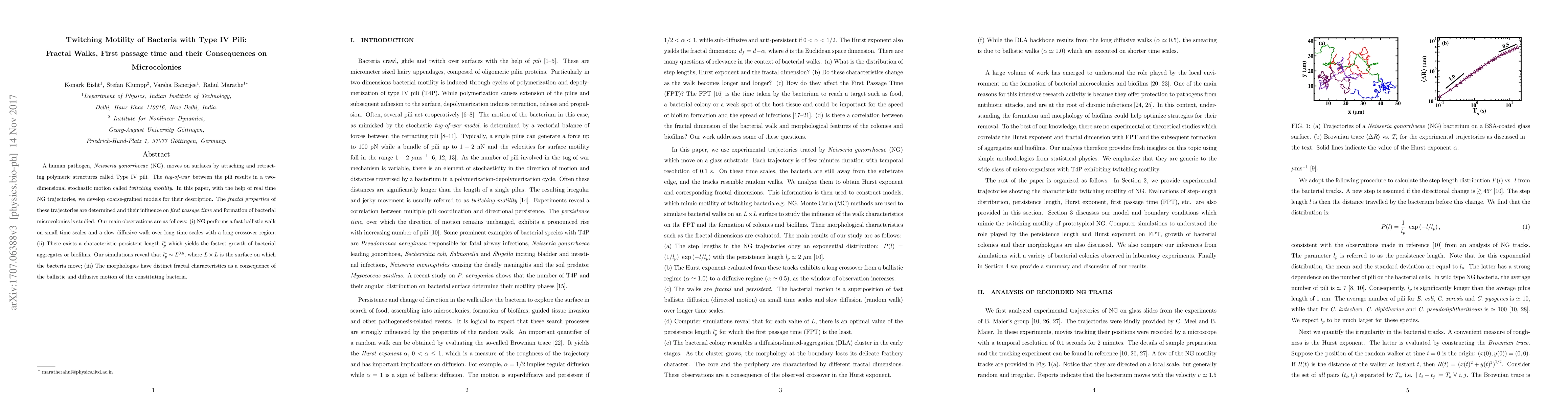 A human pathogen, \textit{Neisseria gonorrhoeae} (NG), moves on surfaces by attaching and retracting polymeric structures called Type IV pili. The \textit{tug-of-war} between the pili results in a two-dimensional stochastic motion called \textit{twitching motility}. In this paper, with the help of real time NG trajectories, we develop coarse-grained models for their description. The \textit{fractal properties} of these trajectories are determined and their influence on \textit{first passage time} and formation of bacterial microcolonies is studied. Our main observations are as follows: (i) NG performs a fast ballistic walk on small time scales and a slow diffusive walk over long time scales with a long crossover region; (ii) There exists a characteristic persistent length $l_p^*$ which yields the fastest growth of bacterial aggregates or biofilms. Our simulations reveal that $l_{p}^{*} \sim L^{0.6}$, where $L\times L$ is the surface on which the bacteria move; (iii) The morphologies have distinct fractal characteristics as a consequence of the ballistic and diffusive motion of the constituting bacteria.
