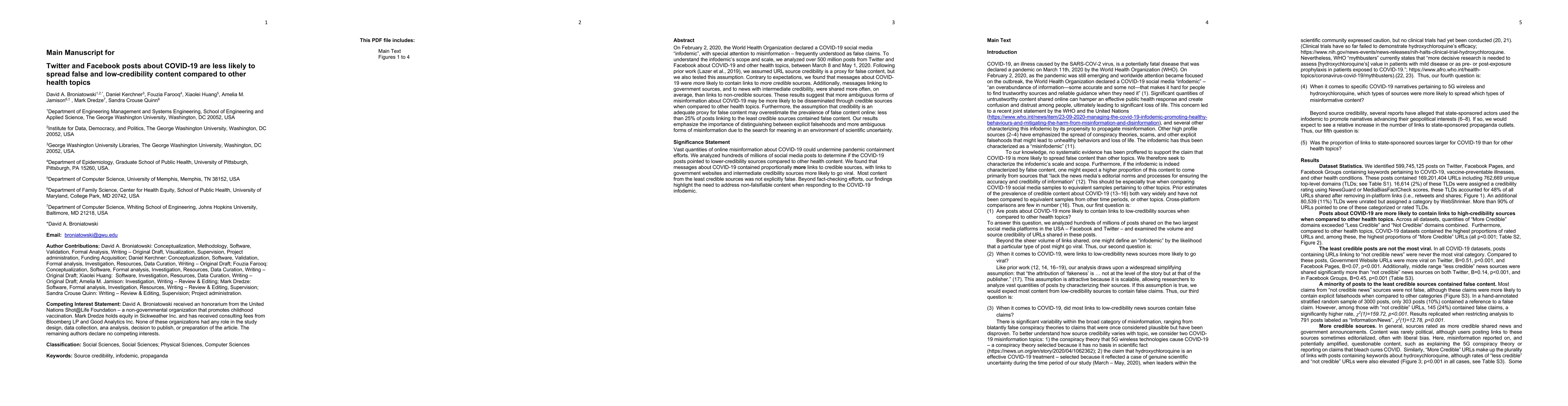 This study analyzed over 500 million social media posts about COVID-19 and other health topics, finding that COVID-19 posts were less likely to spread false or low-credibility content compared to other health topics. The research suggests that credible sources often disseminate ambiguous misinformation about COVID-19, challenging the assumption that credibility equates to truth.