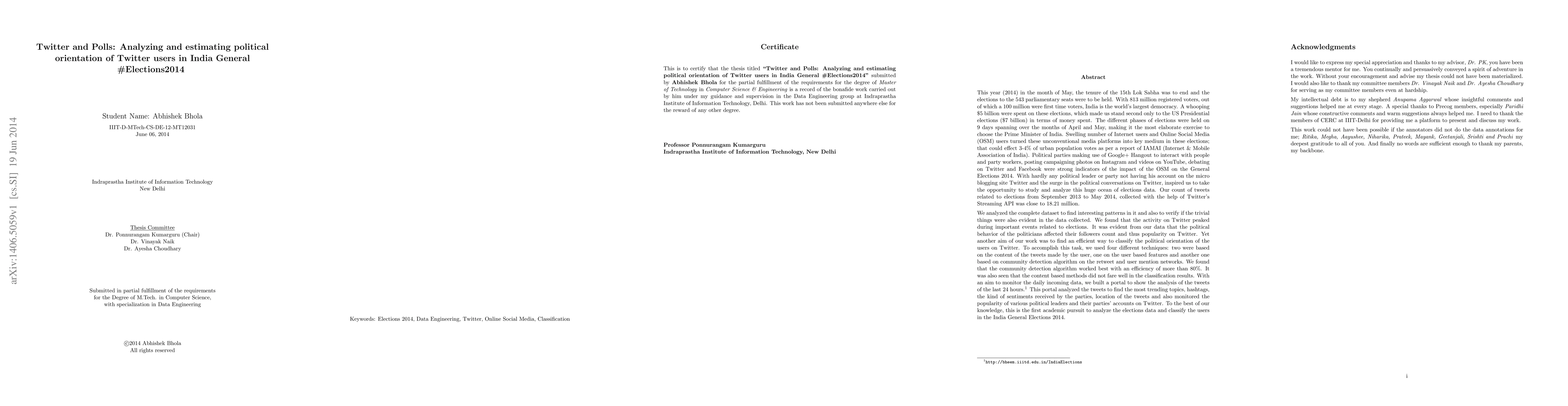 This year (2014) in the month of May, the tenure of the 15th Lok Sabha was to end and the elections to the 543 parliamentary seats were to be held. A whooping $5 billion were spent on these elections, which made us stand second only to the US Presidential elections in terms of money spent. Swelling number of Internet users and Online Social Media (OSM) users could effect 3-4% of urban population votes as per a report of IAMAI (Internet & Mobile Association of India). Our count of tweets related to elections from September 2013 to May 2014, was close to 18.21 million. We analyzed the complete dataset and found that the activity on Twitter peaked during important events. It was evident from our data that the political behavior of the politicians affected their followers count. Yet another aim of our work was to find an efficient way to classify the political orientation of the users on Twitter. We used four different techniques: two were based on the content of the tweets, one on the user based features and another based on community detection algorithm on the retweet and user mention networks. We found that the community detection algorithm worked best. We built a portal to show the analysis of the tweets of the last 24 hours. To the best of our knowledge, this is the first academic pursuit to analyze the elections data and classify the users in the India General Elections 2014.