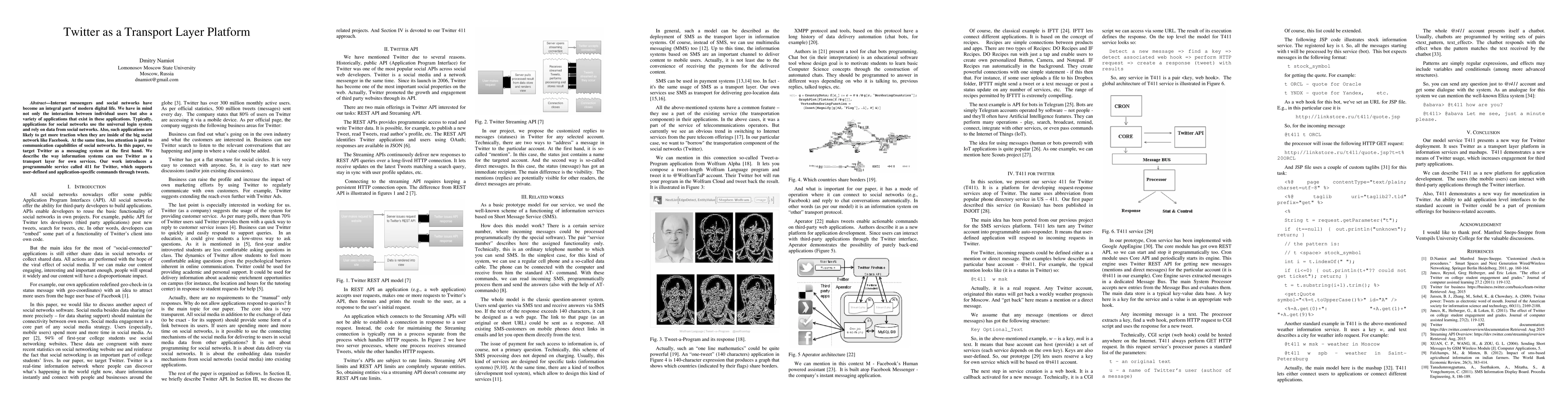 This paper explores Twitter as a messaging platform for information systems, proposing a programmable service named 411 that allows user-defined and application-specific commands via tweets. It emphasizes the potential of leveraging Twitter's communication capabilities for broader service integration.