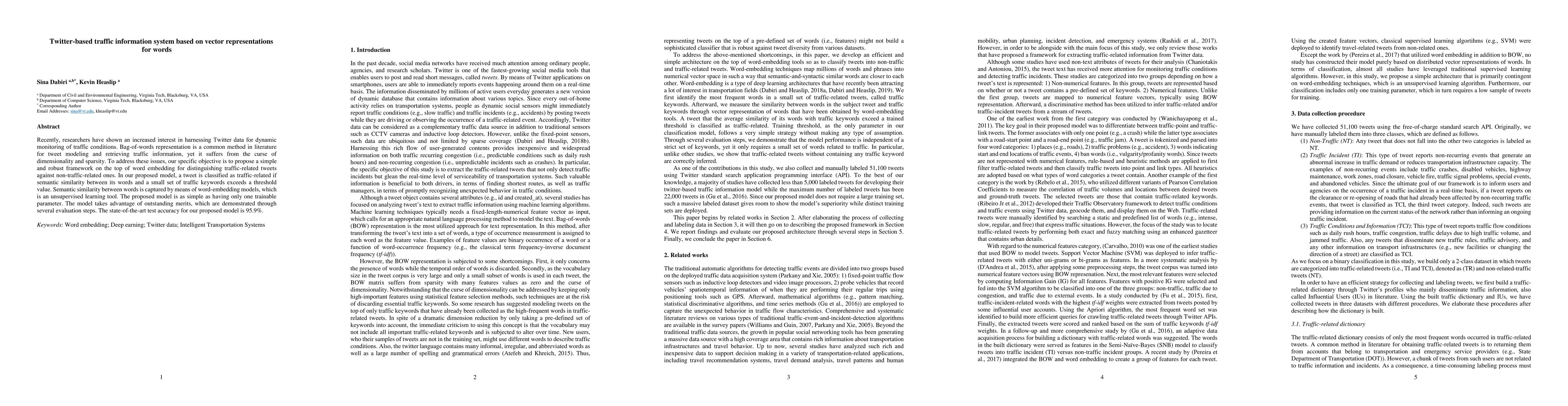 Recently, researchers have shown an increased interest in harnessing Twitter data for dynamic monitoring of traffic conditions. Bag-of-words representation is a common method in literature for tweet modeling and retrieving traffic information, yet it suffers from the curse of dimensionality and sparsity. To address these issues, our specific objective is to propose a simple and robust framework on the top of word embedding for distinguishing traffic-related tweets against non-traffic-related ones. In our proposed model, a tweet is classified as traffic-related if semantic similarity between its words and a small set of traffic keywords exceeds a threshold value. Semantic similarity between words is captured by means of word-embedding models, which is an unsupervised learning tool. The proposed model is as simple as having only one trainable parameter. The model takes advantage of outstanding merits, which are demonstrated through several evaluation steps. The state-of-the-art test accuracy for our proposed model is 95.9%.