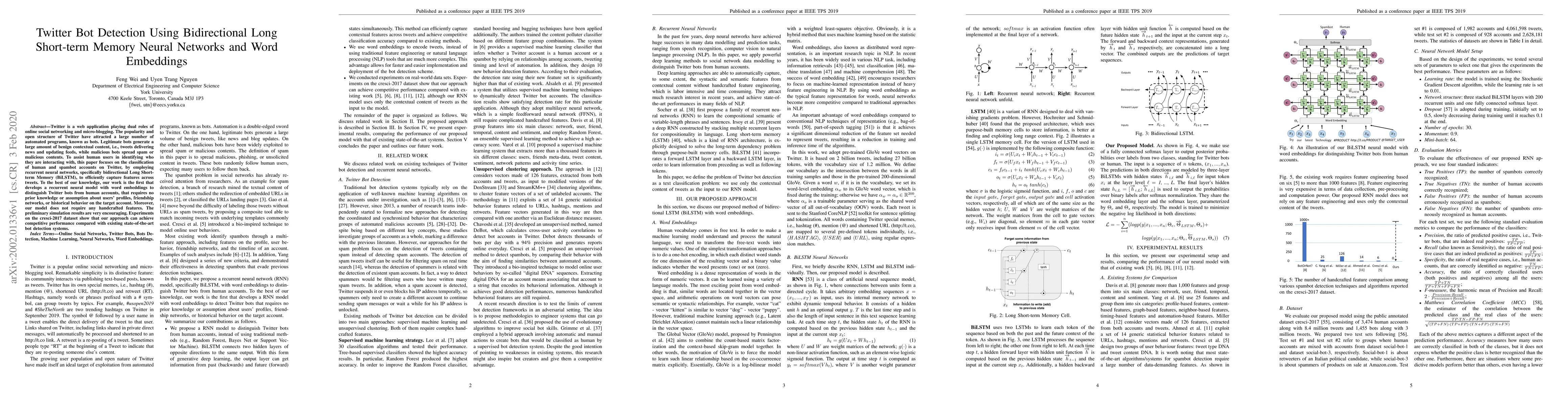 Twitter is a web application playing dual roles of online social networking and micro-blogging. The popularity and open structure of Twitter have attracted a large number of automated programs, known as bots. Legitimate bots generate a large amount of benign contextual content, i.e., tweets delivering news and updating feeds, while malicious bots spread spam or malicious contents. To assist human users in identifying who they are interacting with, this paper focuses on the classification of human and spambot accounts on Twitter, by employing recurrent neural networks, specifically bidirectional Long Short-term Memory (BiLSTM), to efficiently capture features across tweets. To the best of our knowledge, our work is the first that develops a recurrent neural model with word embeddings to distinguish Twitter bots from human accounts, that requires no prior knowledge or assumption about users' profiles, friendship networks, or historical behavior on the target account. Moreover, our model does not require any handcrafted features. The preliminary simulation results are very encouraging. Experiments on the cresci-2017 dataset show that our approach can achieve competitive performance compared with existing state-of-the-art bot detection systems.