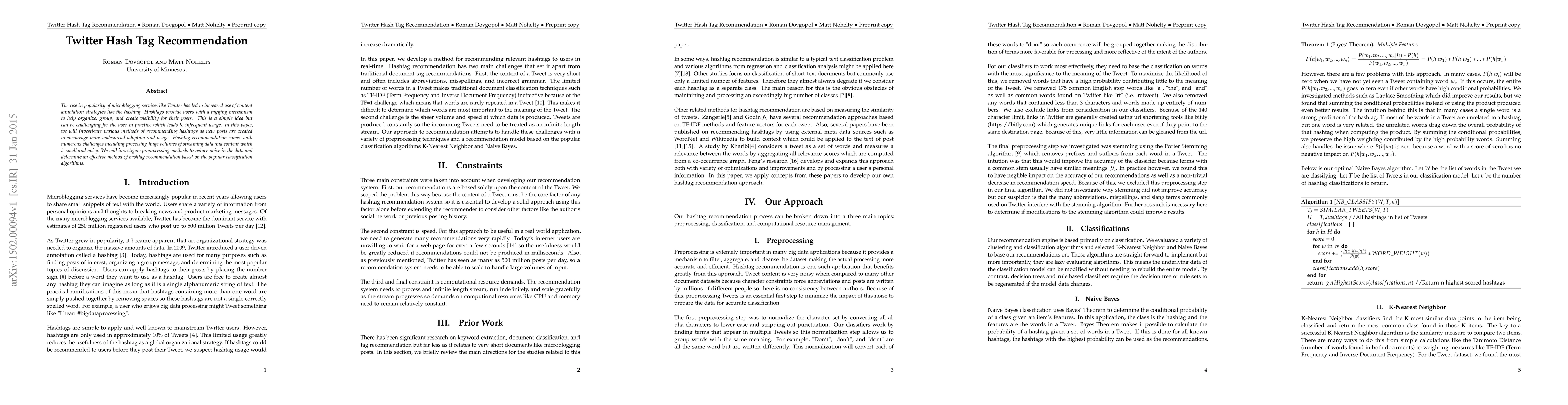 This paper investigates methods for recommending hashtags on Twitter to encourage widespread adoption and usage, focusing on preprocessing techniques to reduce noise in the data.