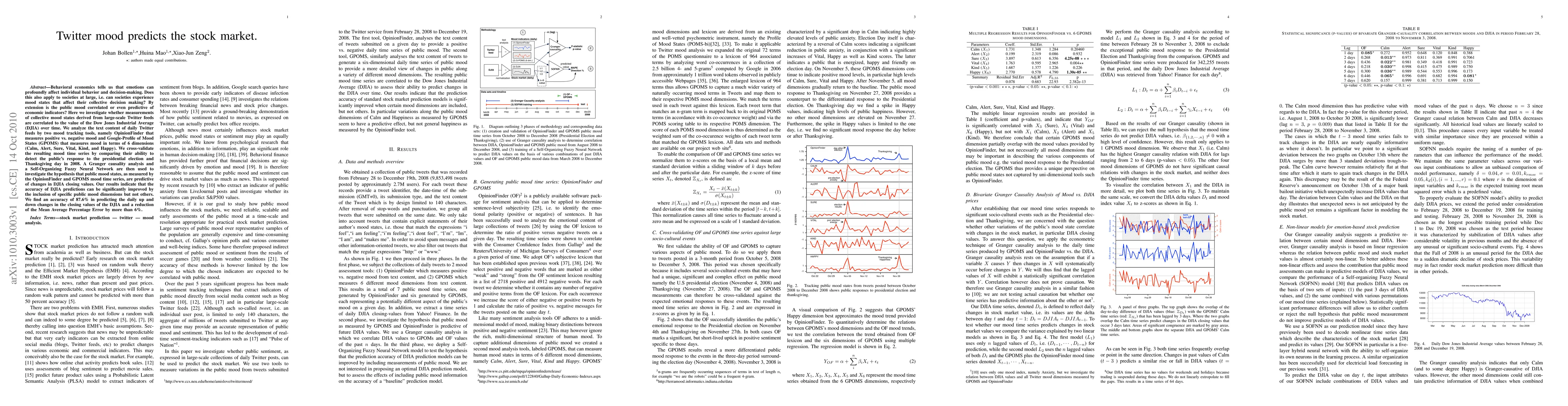 This study explores whether collective mood states derived from Twitter can predict stock market movements, specifically the Dow Jones Industrial Average (DJIA). By analyzing daily Twitter feeds using mood tracking tools, the research finds that certain public mood dimensions significantly improve the accuracy of DJIA predictions, achieving an 87.6% accuracy rate and reducing error by over 6%.