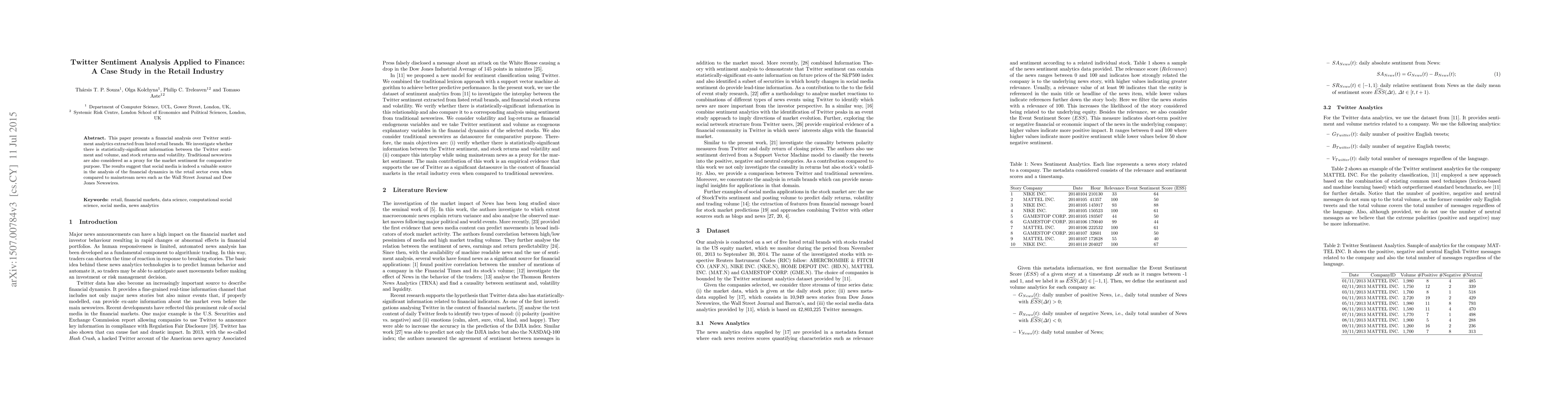 This paper analyzes Twitter sentiment data for listed retail brands to determine if it correlates with stock returns and volatility, finding that social media sentiment is a valuable financial indicator, often more so than traditional newswires. The study highlights the potential of social media analytics in understanding retail sector financial dynamics.