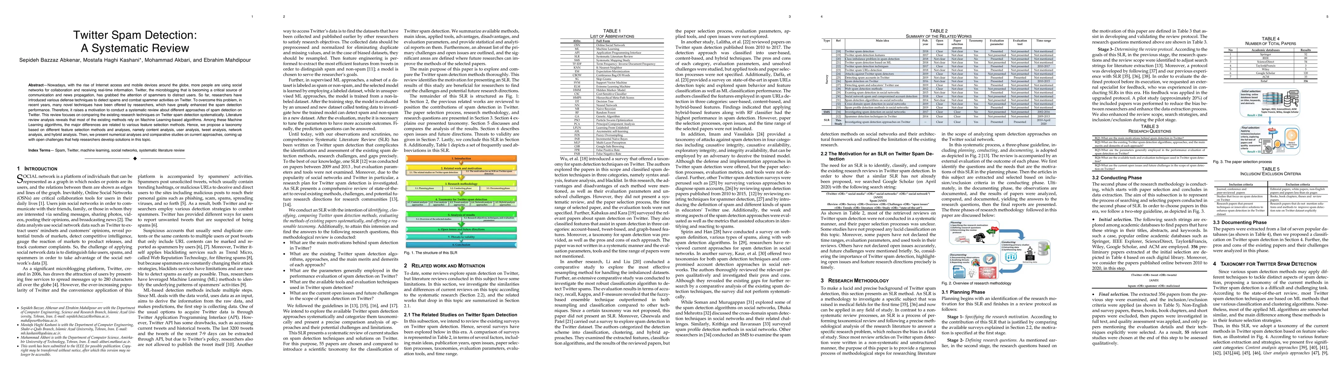 This paper systematically reviews various techniques for detecting spam on Twitter, highlighting that most methods rely on Machine Learning algorithms. The authors propose a taxonomy based on feature selection methods, including content, user, tweet, network, and hybrid analyses, and present a comparative study of current approaches, identifying open challenges for future research.