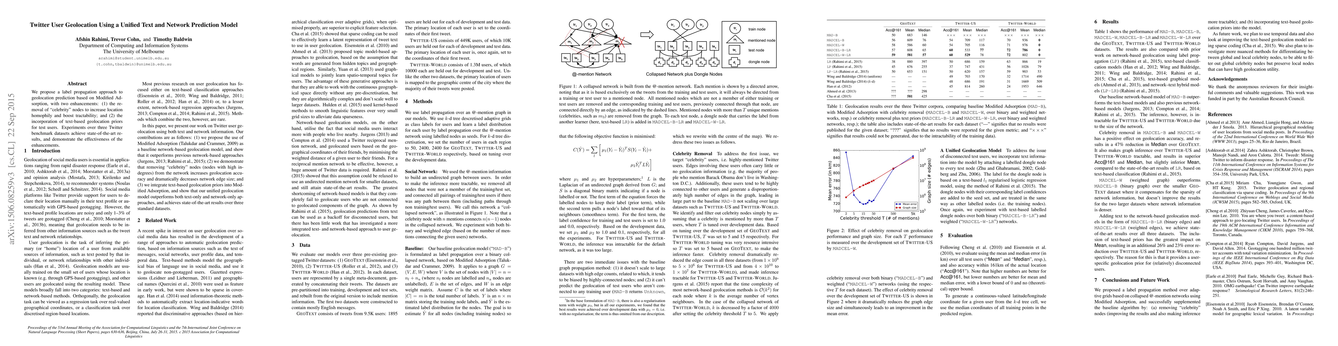This paper proposes a label propagation method for Twitter user geolocation prediction using Modified Adsorption, enhanced by removing "celebrity" nodes and incorporating text-based geolocation priors. Experiments on three datasets show state-of-the-art performance, validating the effectiveness of these enhancements.