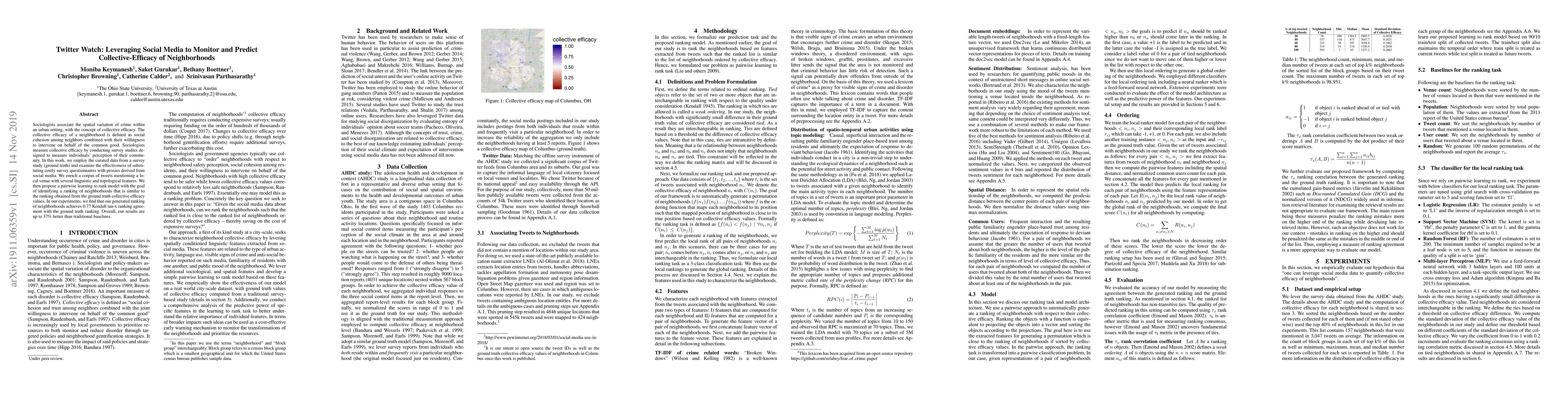 Sociologists associate the spatial variation of crime within an urban setting, with the concept of collective efficacy. The collective efficacy of a neighborhood is defined as social cohesion among neighbors combined with their willingness to intervene on behalf of the common good. Sociologists measure collective efficacy by conducting survey studies designed to measure individuals' perception of their community. In this work, we employ the curated data from a survey study (ground truth) and examine the effectiveness of substituting costly survey questionnaires with proxies derived from social media. We enrich a corpus of tweets mentioning a local venue with several linguistic and topological features. We then propose a pairwise learning to rank model with the goal of identifying a ranking of neighborhoods that is similar to the ranking obtained from the ground truth collective efficacy values. In our experiments, we find that our generated ranking of neighborhoods achieves 0.77 Kendall tau-x ranking agreement with the ground truth ranking. Overall, our results are up to 37% better than traditional baselines.