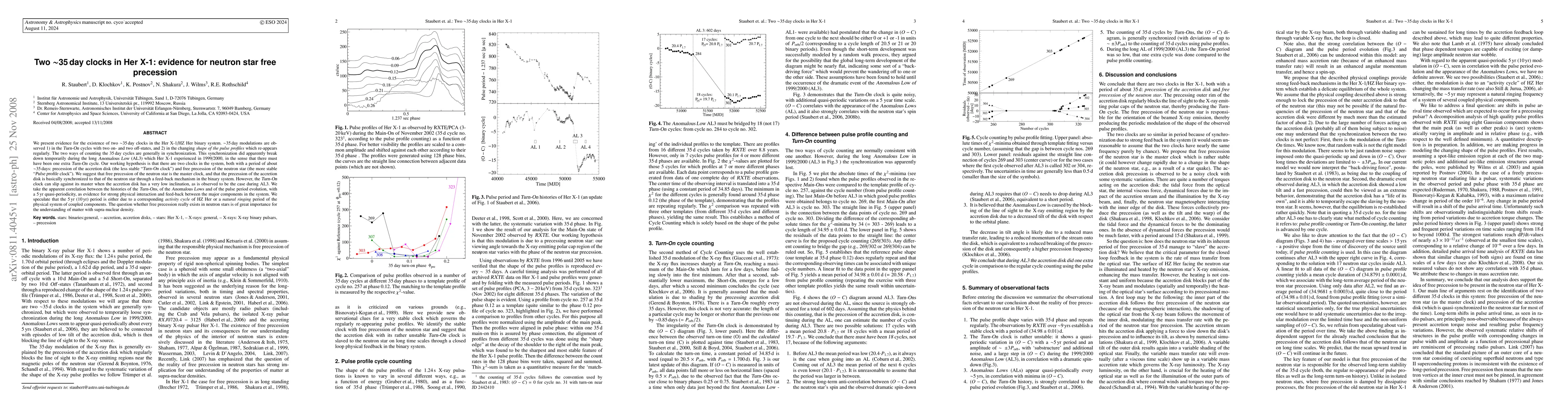 Researchers found evidence for two ~35 day clocks in the Her X-1/HZ binary system, with one clock related to the neutron star's free precession and the other to the accretion disk's precession, suggesting a strong physical interaction between the system's components.