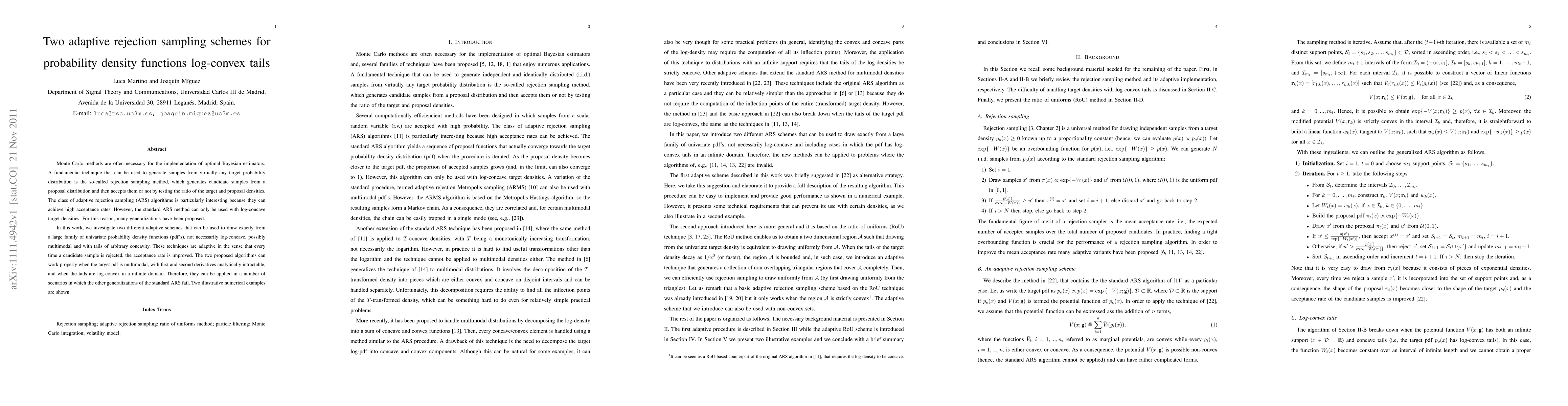 Monte Carlo methods are often necessary for the implementation of optimal Bayesian estimators. A fundamental technique that can be used to generate samples from virtually any target probability distribution is the so-called rejection sampling method, which generates candidate samples from a proposal distribution and then accepts them or not by testing the ratio of the target and proposal densities. The class of adaptive rejection sampling (ARS) algorithms is particularly interesting because they can achieve high acceptance rates. However, the standard ARS method can only be used with log-concave target densities. For this reason, many generalizations have been proposed. In this work, we investigate two different adaptive schemes that can be used to draw exactly from a large family of univariate probability density functions (pdf's), not necessarily log-concave, possibly multimodal and with tails of arbitrary concavity. These techniques are adaptive in the sense that every time a candidate sample is rejected, the acceptance rate is improved. The two proposed algorithms can work properly when the target pdf is multimodal, with first and second derivatives analytically intractable, and when the tails are log-convex in a infinite domain. Therefore, they can be applied in a number of scenarios in which the other generalizations of the standard ARS fail. Two illustrative numerical examples are shown.