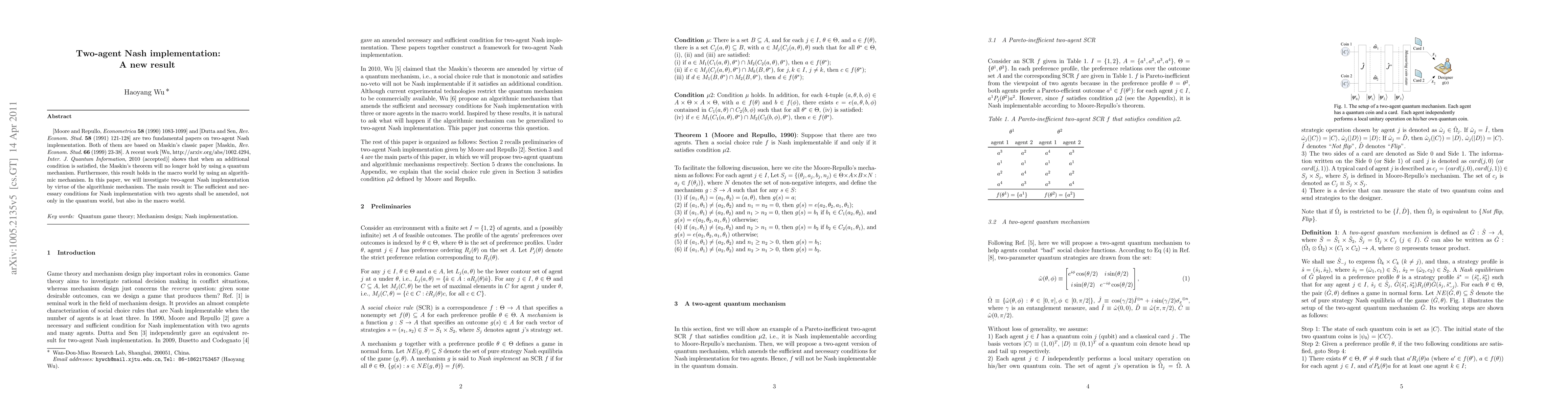 This paper explores two-agent Nash implementation using a quantum mechanism introduced by Wu, demonstrating that a two-agent social choice rule satisfying Condition $\mu2$ is no longer Nash implementable under Condition $\lambda'$. The findings also extend to classical two-agent algorithms, showing applicability in both quantum and macro worlds.