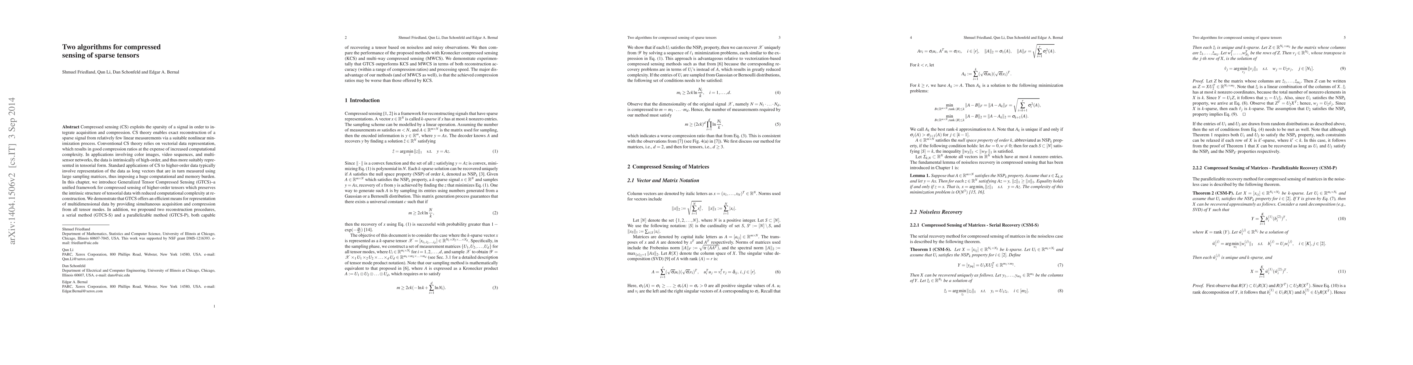 Compressed sensing (CS) exploits the sparsity of a signal in order to integrate acquisition and compression. CS theory enables exact reconstruction of a sparse signal from relatively few linear measurements via a suitable nonlinear minimization process. Conventional CS theory relies on vectorial data representation, which results in good compression ratios at the expense of increased computational complexity. In applications involving color images, video sequences, and multi-sensor networks, the data is intrinsically of high-order, and thus more suitably represented in tensorial form. Standard applications of CS to higher-order data typically involve representation of the data as long vectors that are in turn measured using large sampling matrices, thus imposing a huge computational and memory burden. In this chapter, we introduce Generalized Tensor Compressed Sensing (GTCS)--a unified framework for compressed sensing of higher-order tensors which preserves the intrinsic structure of tensorial data with reduced computational complexity at reconstruction. We demonstrate that GTCS offers an efficient means for representation of multidimensional data by providing simultaneous acquisition and compression from all tensor modes. In addition, we propound two reconstruction procedures, a serial method (GTCS-S) and a parallelizable method (GTCS-P), both capable of recovering a tensor based on noiseless and noisy observations. We then compare the performance of the proposed methods with Kronecker compressed sensing (KCS) and multi-way compressed sensing (MWCS). We demonstrate experimentally that GTCS outperforms KCS and MWCS in terms of both reconstruction accuracy (within a range of compression ratios) and processing speed. The major disadvantage of our methods (and of MWCS as well), is that the achieved compression ratios may be worse than those offered by KCS.