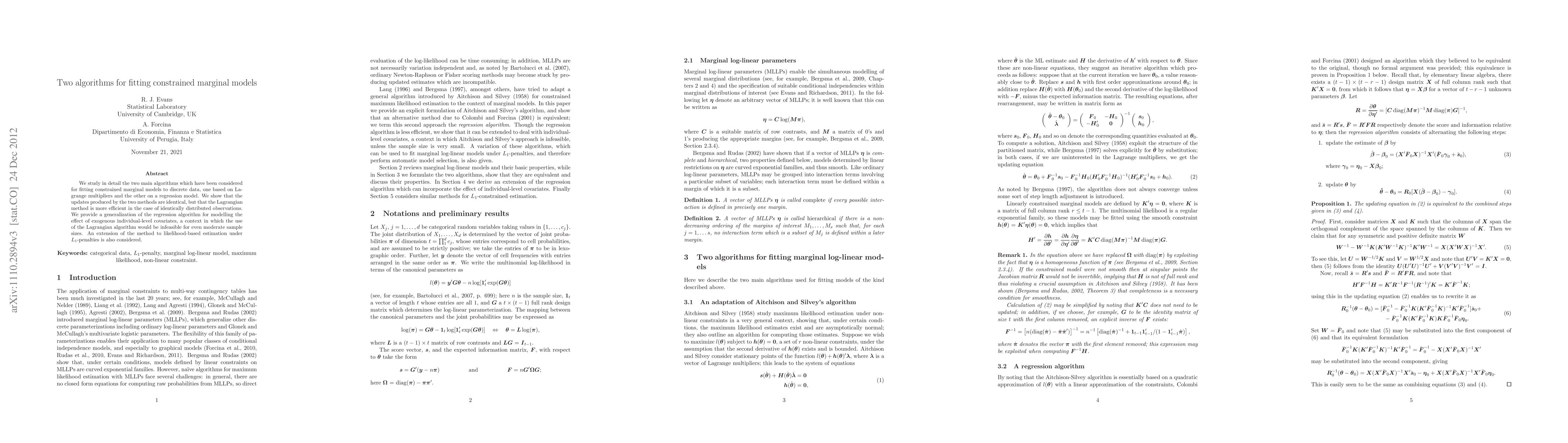 This paper compares two algorithms for fitting constrained marginal models to discrete data, finding they produce identical updates but the Lagrangian method is more efficient for identically distributed observations. It also presents a regression algorithm generalization for individual-level covariates and explores an extension to likelihood-based estimation under L1-penalties.
