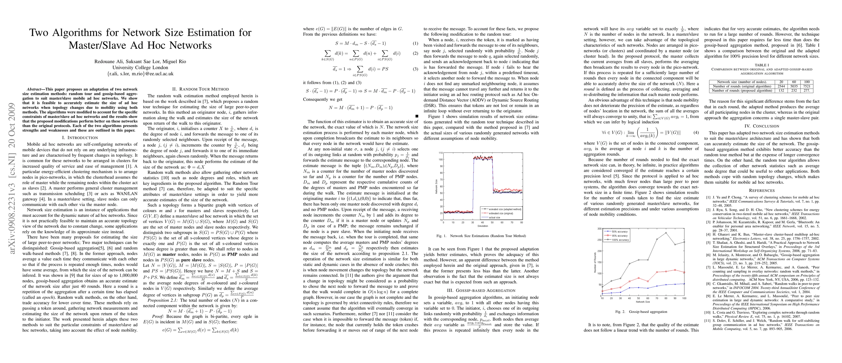 This paper adapts random tour and gossip-based aggregation methods for estimating network size in master/slave mobile ad hoc networks, demonstrating improved performance over original protocols due to modifications addressing network mobility. The study highlights the strengths and weaknesses of each adapted algorithm.