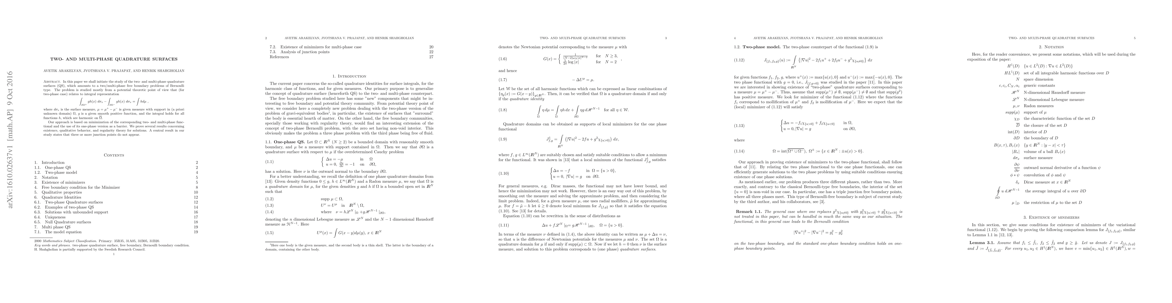 In this paper we shall initiate the study of the two- and multi-phase quadrature surfaces (QS), which amounts to a two/multi-phase free boundary problems of Bernoulli type. The problem is studied mostly from a potential theoretic point of view that (for two-phase case) relates to integral representation $$ \int_{\partial \Omega^+} g h (x) \ d\sigma_x - \int_{\partial \Omega^-} g h (x) \ d\sigma_x= \int h d\mu \ , $$ where $d\sigma_x$ is the surface measure, $\mu= \mu^+ - \mu^-$ is given measure with support in (a priori unknown domain) $\Omega$, $g$ is a given smooth positive function, and the integral holds for all functions $h$, which are harmonic on $\overline \Omega$. Our approach is based on minimization of the corresponding two- and multi-phase functional and the use of its one-phase version as a barrier. We prove several results concerning existence, qualitative behavior, and regularity theory for solutions. A central result in our study states that three or more junction points do not appear.