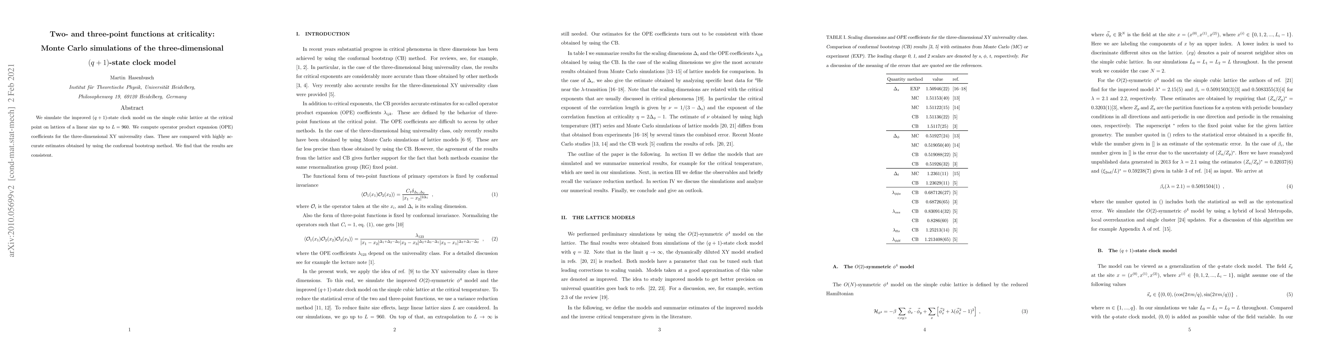 We simulate the improved $(q+1)$-state clock model on the simple cubic lattice at the critical point on lattices of a linear size up to $L=960$. We compute operator product expansion (OPE) coefficients for the three-dimensional XY universality class. These are compared with highly accurate estimates obtained by using the conformal bootstrap method. We find that the results are consistent.