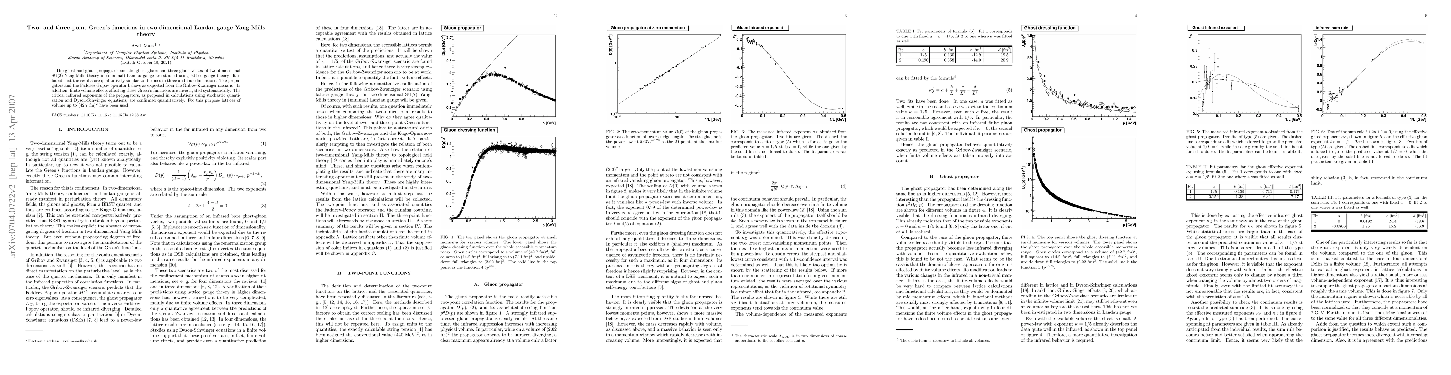The ghost and gluon propagator and the ghost-gluon and three-gluon vertex of two-dimensional SU(2) Yang-Mills theory in (minimal) Landau gauge are studied using lattice gauge theory. It is found that the results are qualitatively similar to the ones in three and four dimensions. The propagators and the Faddeev-Popov operator behave as expected from the Gribov-Zwanziger scenario. In addition, finite volume effects affecting these Green's functions are investigated systematically. The critical infrared exponents of the propagators, as proposed in calculations using stochastic quantization and Dyson-Schwinger equations, are confirmed quantitatively. For this purpose lattices of volume up to (42.7 fm)^2 have been used.