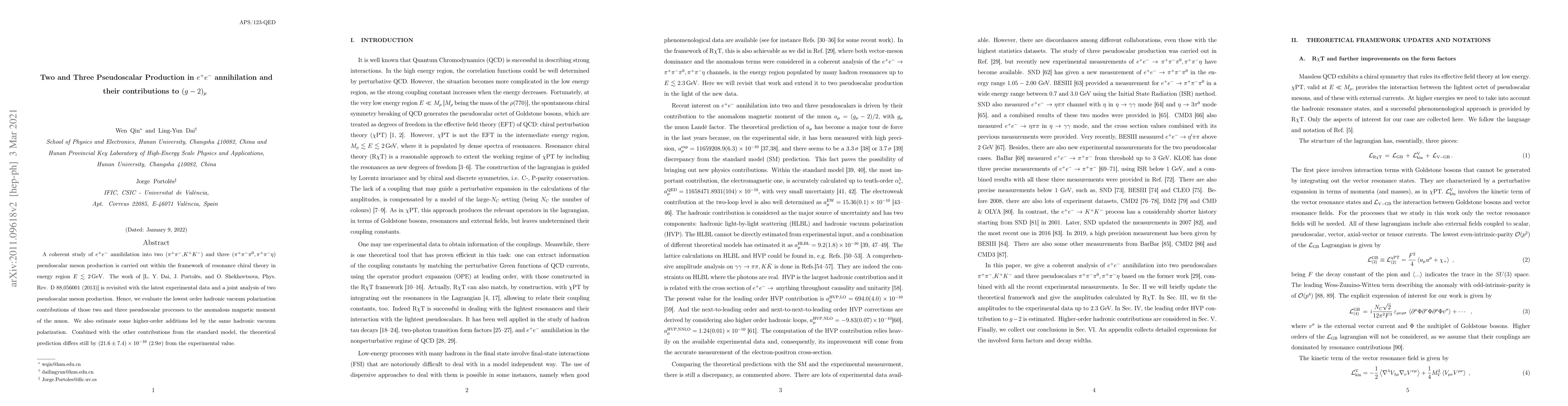 This paper studies $e^{+}e^{-}$ annihilation into two and three pseudoscalar mesons using resonance chiral theory, revisiting previous work with updated data. It evaluates contributions to the anomalous magnetic moment of the muon, finding a discrepancy of $(21.6 \pm 7.4)\times 10^{-10}$ (2.9$\sigma$) between theoretical predictions and experimental values.