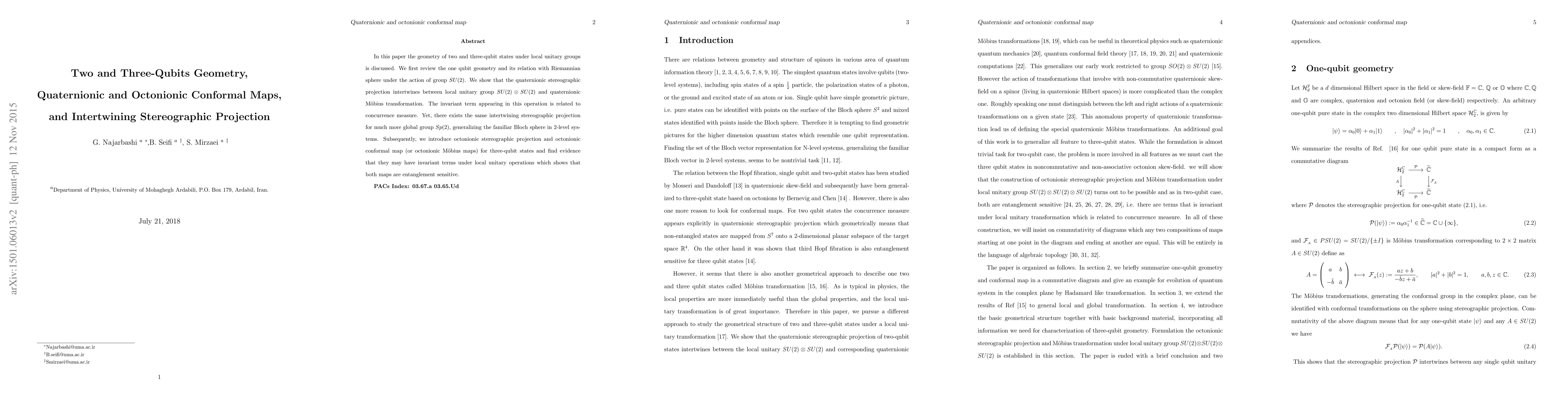 This paper explores the geometry of two and three-qubit states under local unitary groups, demonstrating the intertwining of quaternionic and octonionic stereographic projections with conformal maps. It shows that these projections relate to the concurrence measure and entanglement sensitivity.
