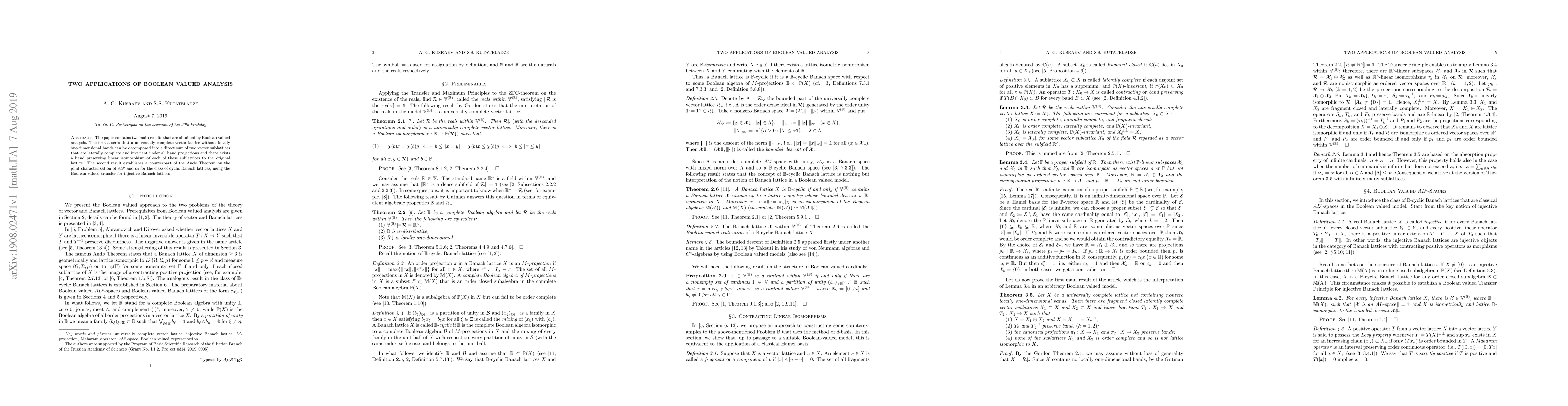 The paper contains two main results that are obtained by Boolean valued analysis. The first asserts that a universally complete vector lattice without locally one-dimensional bands can be decomposed into a direct sum of two vector sublattices that are laterally complete and invariant under all band projections and there exists a band preserving linear isomorphism of each of these sublattices to the original lattice. The second result establishes a counterpart of the Ando Theorem on the joint characterization of $A\!L^p$ and $c_0$ for the class of cyclic Banach lattices, using the Boolean valued transfer for injective Banach lattices.