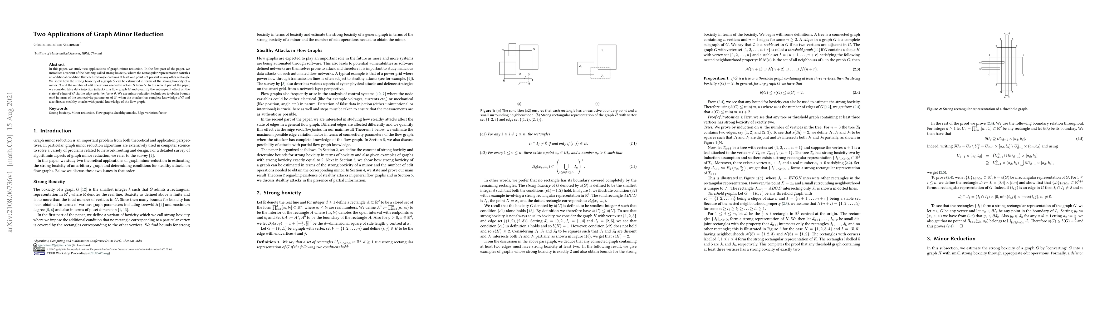 This paper explores two applications of graph minor reduction: estimating strong boxicity and analyzing false data injection attacks in flow graphs, providing bounds on the edge variation factor via connectivity parameters.