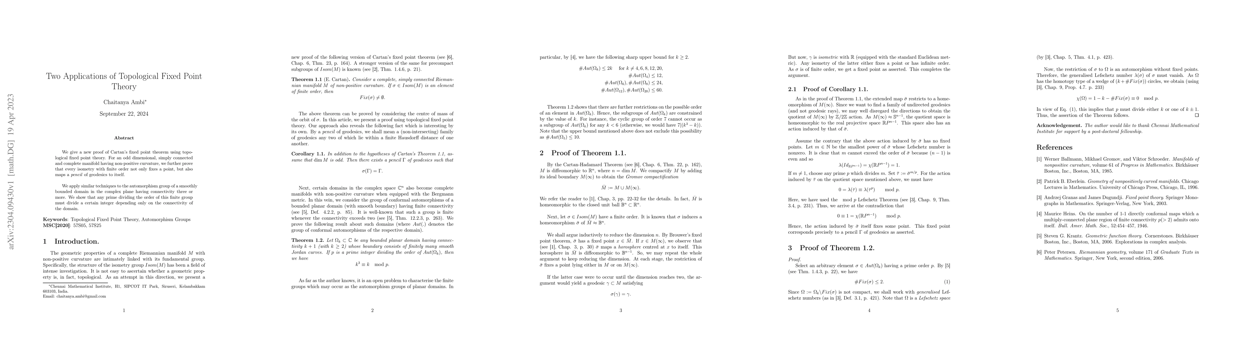 We give a new proof of Cartan's fixed point theorem using topological fixed point theory. For an odd dimensional, simply connected and complete manifold having non-positive curvature, we further prove that every isometry with finite order not only fixes a point, but also maps a pencil of geodesics to itself. We apply similar techniques to the automorphism group of a smoothly bounded domain in the complex plane having connectivity three or more. We show that any prime dividing the order of this finite group must divide a certain integer depending only on the connectivity of the domain.