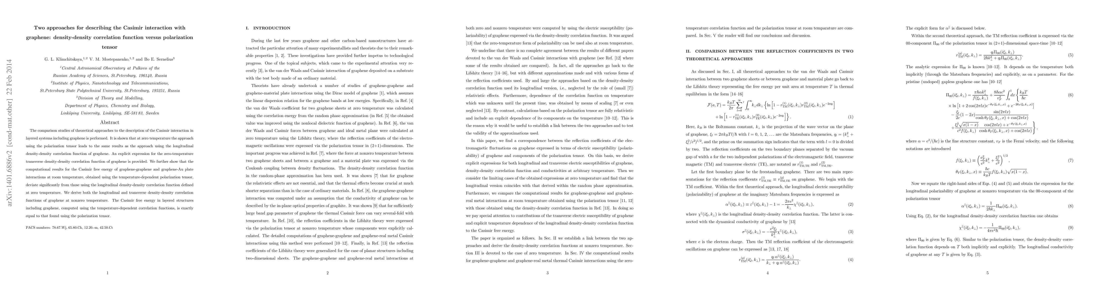The comparison studies of theoretical approaches to the description of the Casimir interaction in layered systems including graphene is performed. It is shown that at zero temperature the approach using the polarization tensor leads to the same results as the approach using the longitudinal density-density correlation function of graphene. An explicit expression for the zero-temperature transverse density-density correlation function of graphene is provided. We further show that the computational results for the Casimir free energy of graphene-graphene and graphene-Au plate interactions at room temperature, obtained using the temperature-dependent polarization tensor, deviate significantly from those using the longitudinal density-density correlation function defined at zero temperature. We derive both the longitudinal and transverse density-density correlation functions of graphene at nonzero temperature. The Casimir free energy in layered structures including graphene, computed using the temperature-dependent correlation functions, is exactly equal to that found using the polarization tensor.