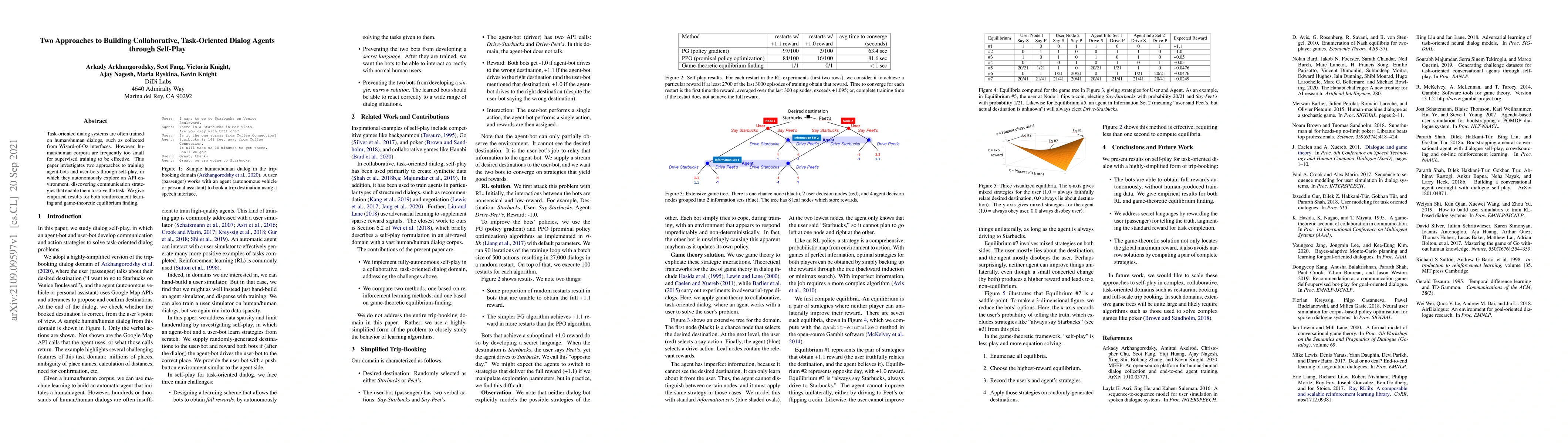 Researchers explored two approaches to training task-oriented dialog agents through self-play, achieving success in both reinforcement learning and game-theoretic equilibrium finding.
