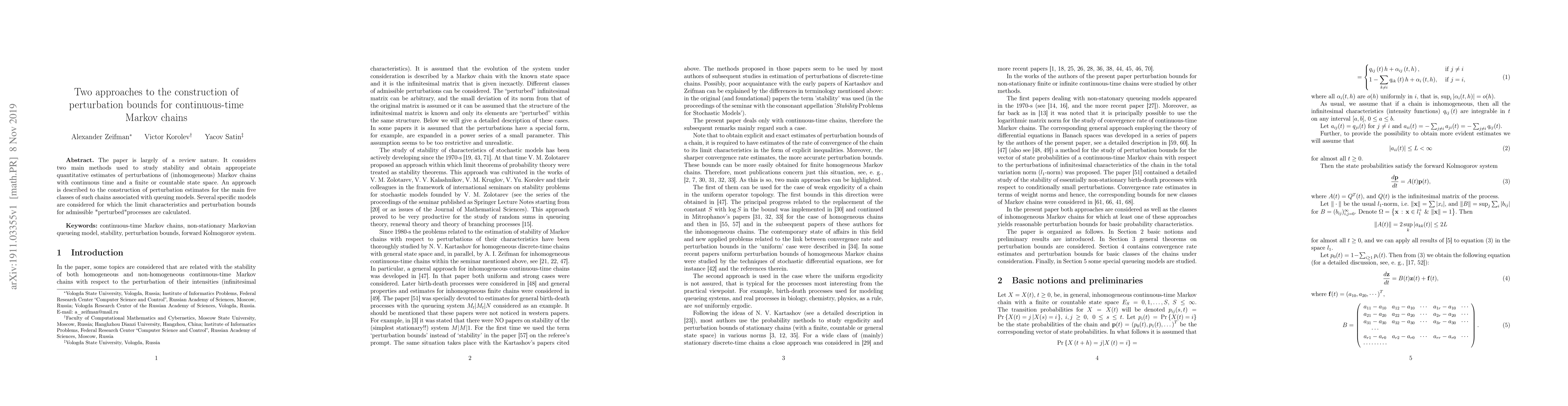 This paper reviews two main methods for constructing perturbation bounds for continuous-time Markov chains, focusing on stability and quantitative estimates. It applies these techniques to five classes of Markov chains related to queuing models, calculating specific perturbation bounds for various models.