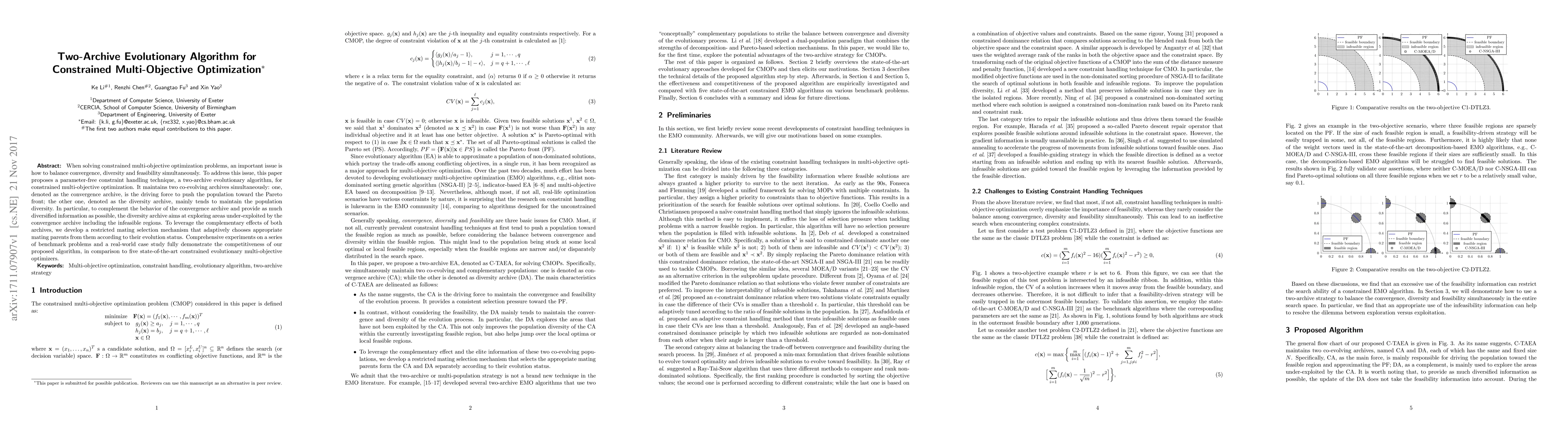 This paper proposes a two-archive evolutionary algorithm for solving constrained multi-objective optimization problems, balancing convergence, diversity, and feasibility. The algorithm employs two co-evolving populations to drive convergence and maintain diversity, with a restricted mating selection mechanism to leverage their complementary effects.