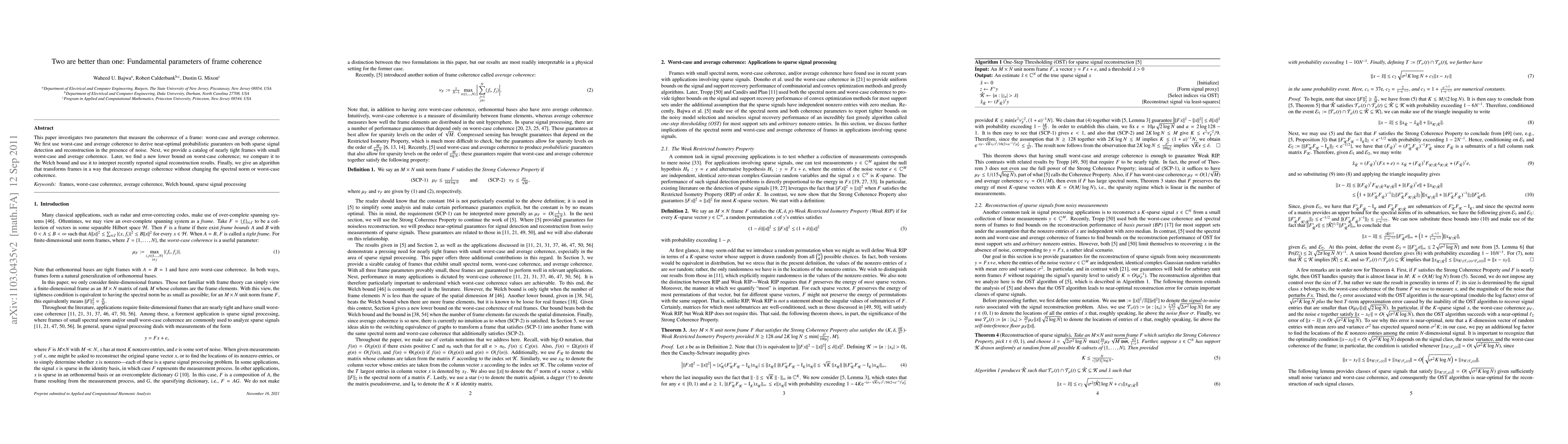 This paper investigates two parameters that measure the coherence of a frame: worst-case and average coherence. We first use worst-case and average coherence to derive near-optimal probabilistic guarantees on both sparse signal detection and reconstruction in the presence of noise. Next, we provide a catalog of nearly tight frames with small worst-case and average coherence. Later, we find a new lower bound on worst-case coherence; we compare it to the Welch bound and use it to interpret recently reported signal reconstruction results. Finally, we give an algorithm that transforms frames in a way that decreases average coherence without changing the spectral norm or worst-case coherence.